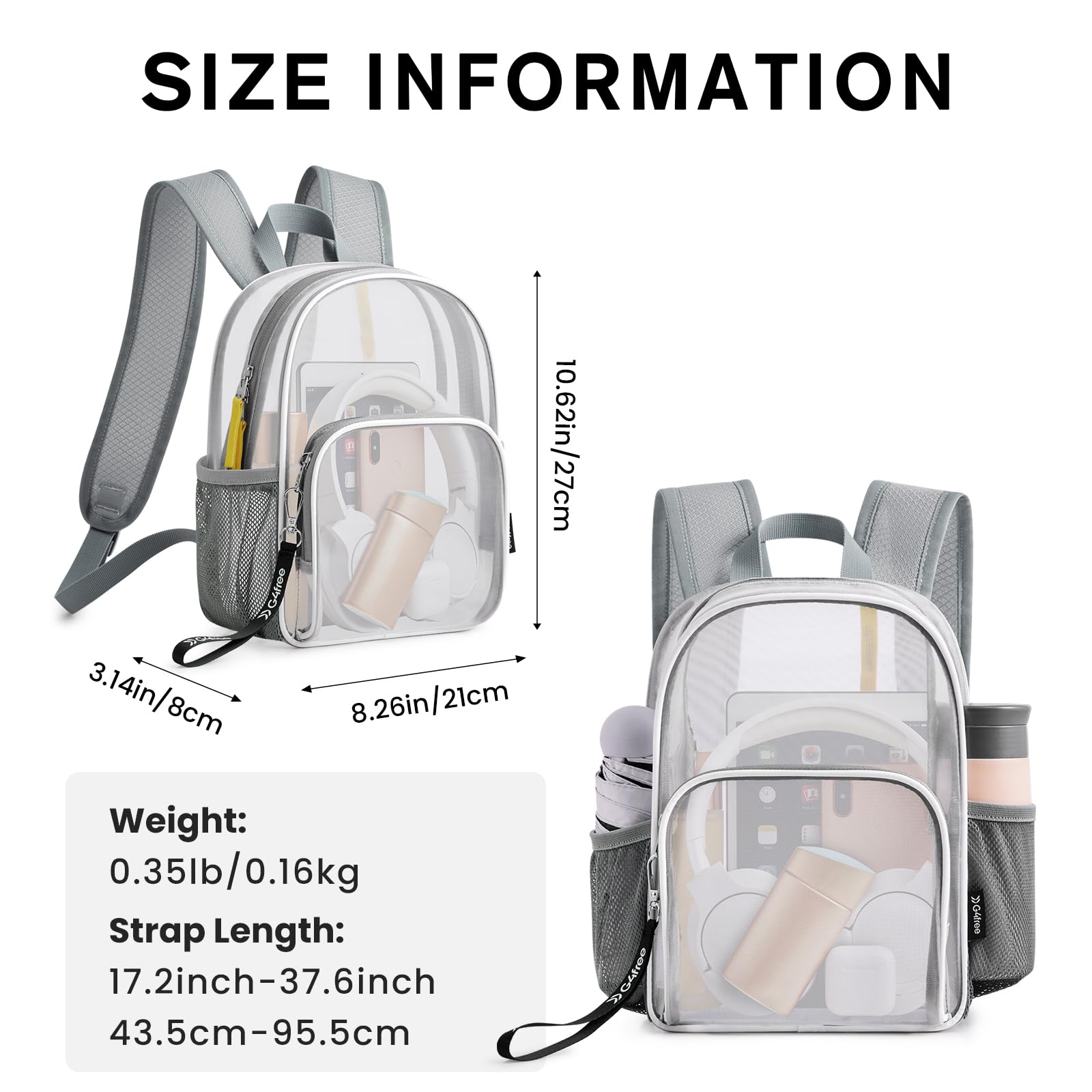 - 【ROOMY CLEAR BACKPACK】 Dimensions 8.26"L x 3.14"W x 10.62"H. Only weight:0.37lb. This clear mesh backpack has a main pocket and a front pocket. The space is roomy enough to store all your small daily necessities, such as small wallet, phone, lipstick, tissues, and sunglasses, cash, cards, and tickets, 2 side mesh pockets for water bottles or folding umbrellas, please make our clear bag an essential for your concert outfit