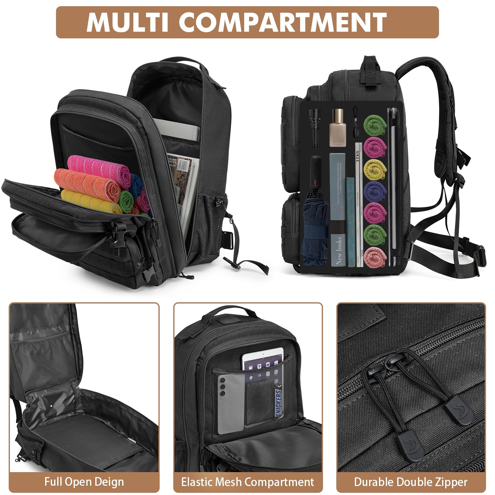 - 【Large Capacity & Multiple Compartments】This Military backpack has a 45L capacity and 4 zippered compartments, providing ample space for all your gear and supplies. The main compartment opens flat to 180 degrees for easy access. It also has a middle mesh compartment and two front compartments for organized storage.