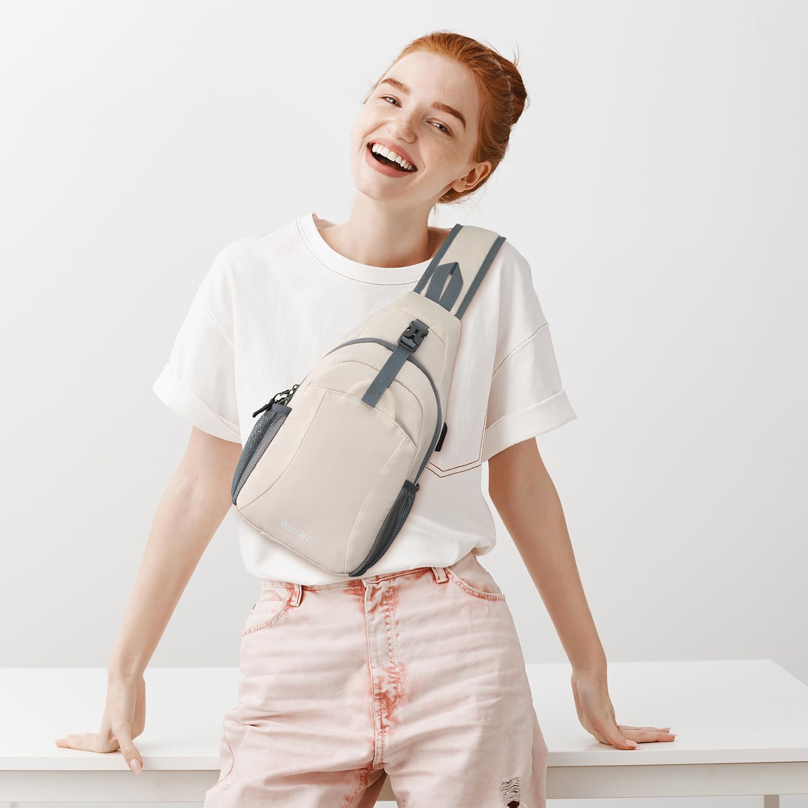 G4Free Sling Bag RFID Crossbody Sling Backpack with USB Charging Port, Travel Hiking Daypack Shoulder Chest Bag for Women Men(Ivory)