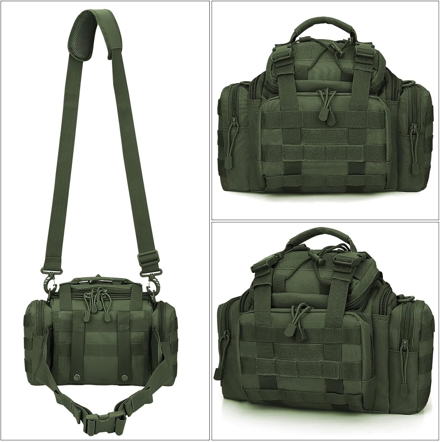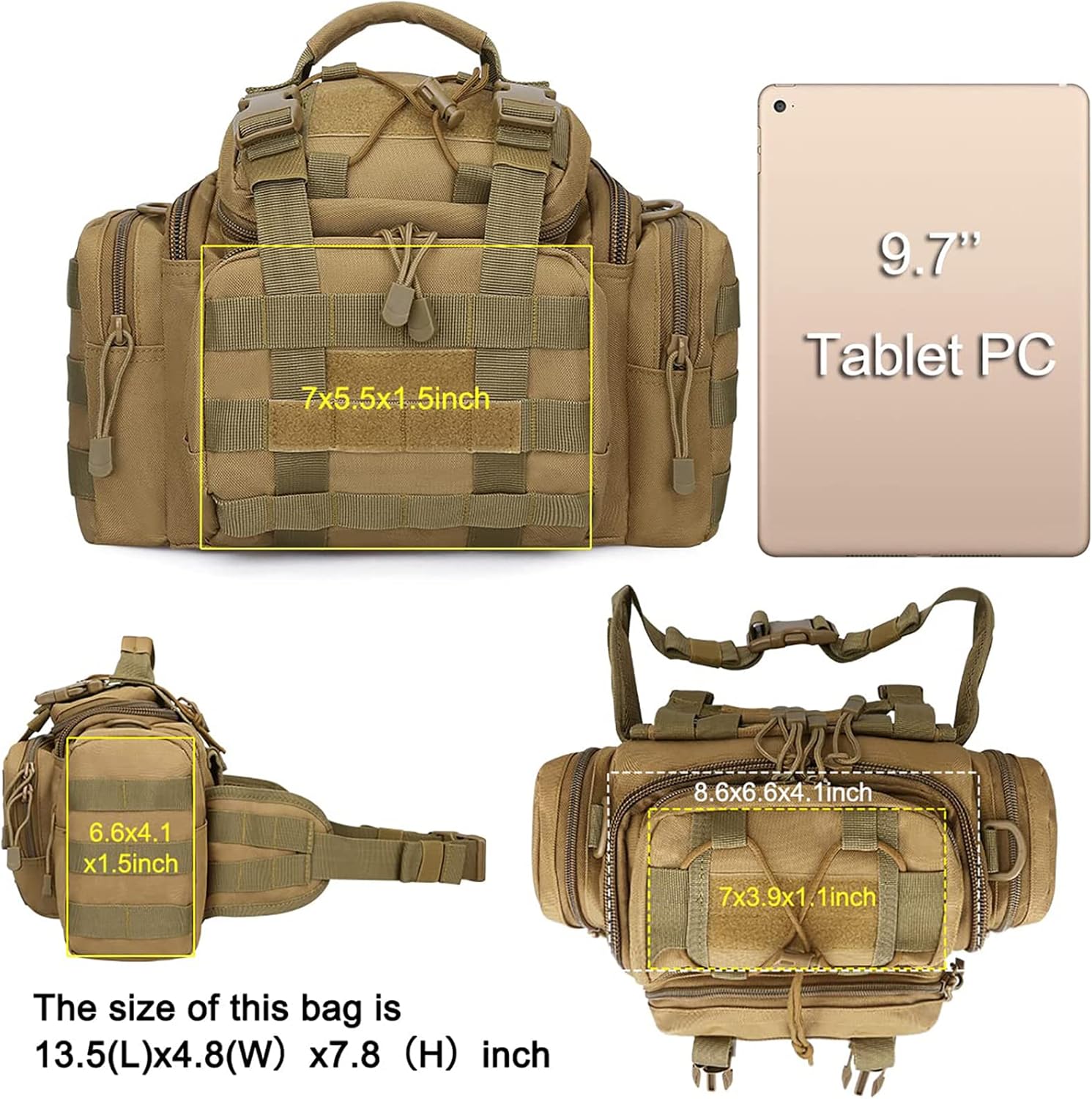 - 【Large Capacity】Our tactical bag Size Approx. Regular Size:13.5(L)x4.8(W)x7.8(H)inch; Main compartment:8.6x6.6x4.1inch; Top compartments:7x3.9x1.1inch; Front compartments:7x5.5x1.5inch; Two side pockets:6.6x4.1x1.5inch.
