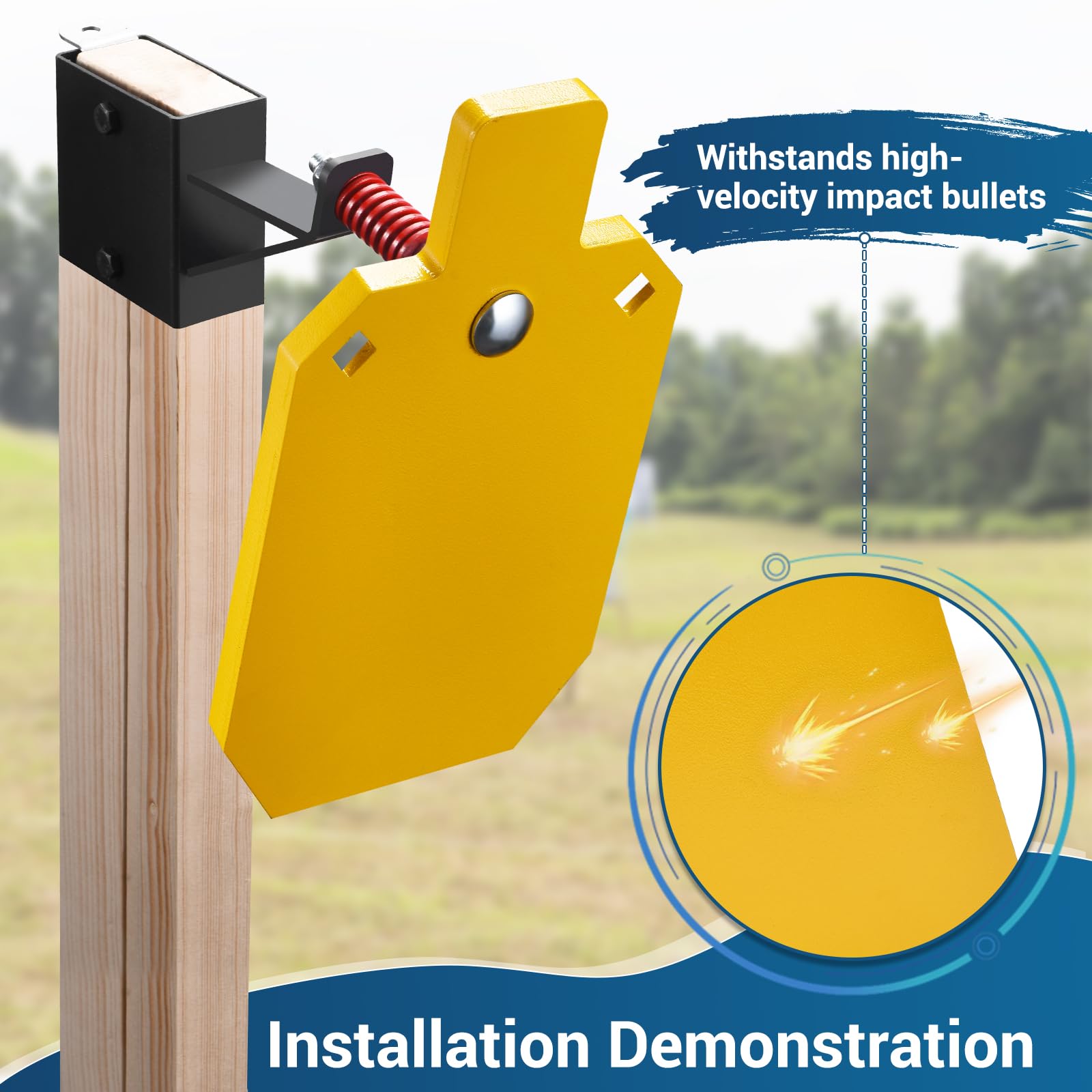- 【Mitigating Bullet Impact】The compression spring of the T-post target hanger can leave elastic space for a cushioning effect in use. The steel target plate is slightly tilted downward, which is suitable for deflecting downward while shooting splatters, making it safer to use.