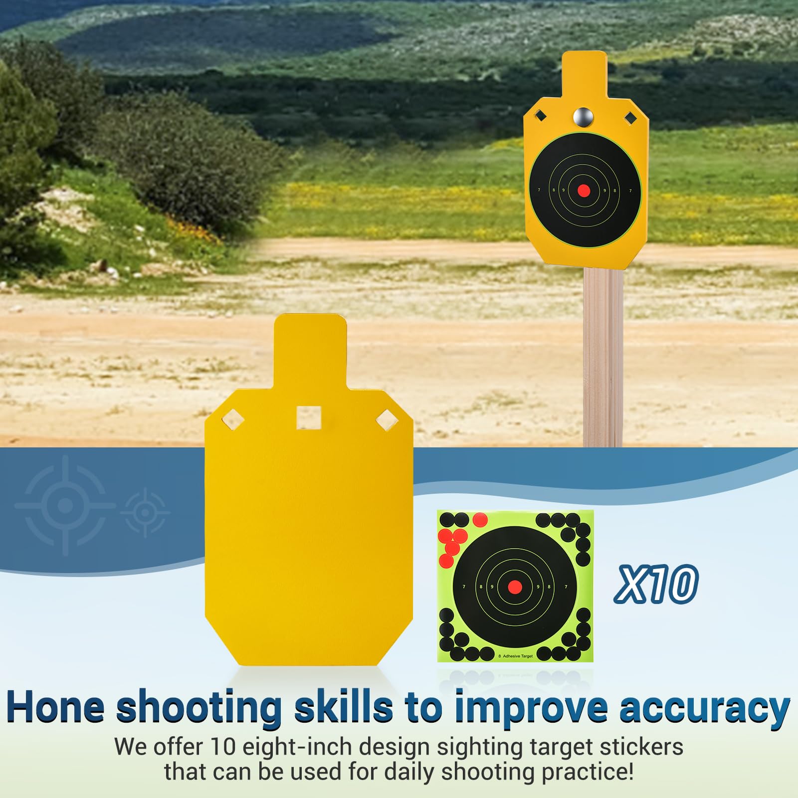 - 【High Visibility 7" x 12" AR500 Steel Target & Comes with 10 Eight-Inch Target Stickers】Neon-colored powder coated for high visibility in both light and dark environments. Suitable for 2×4 stake of shooting target boards, comes with 10 eight-inch stickers that can be used for daily shooting training.