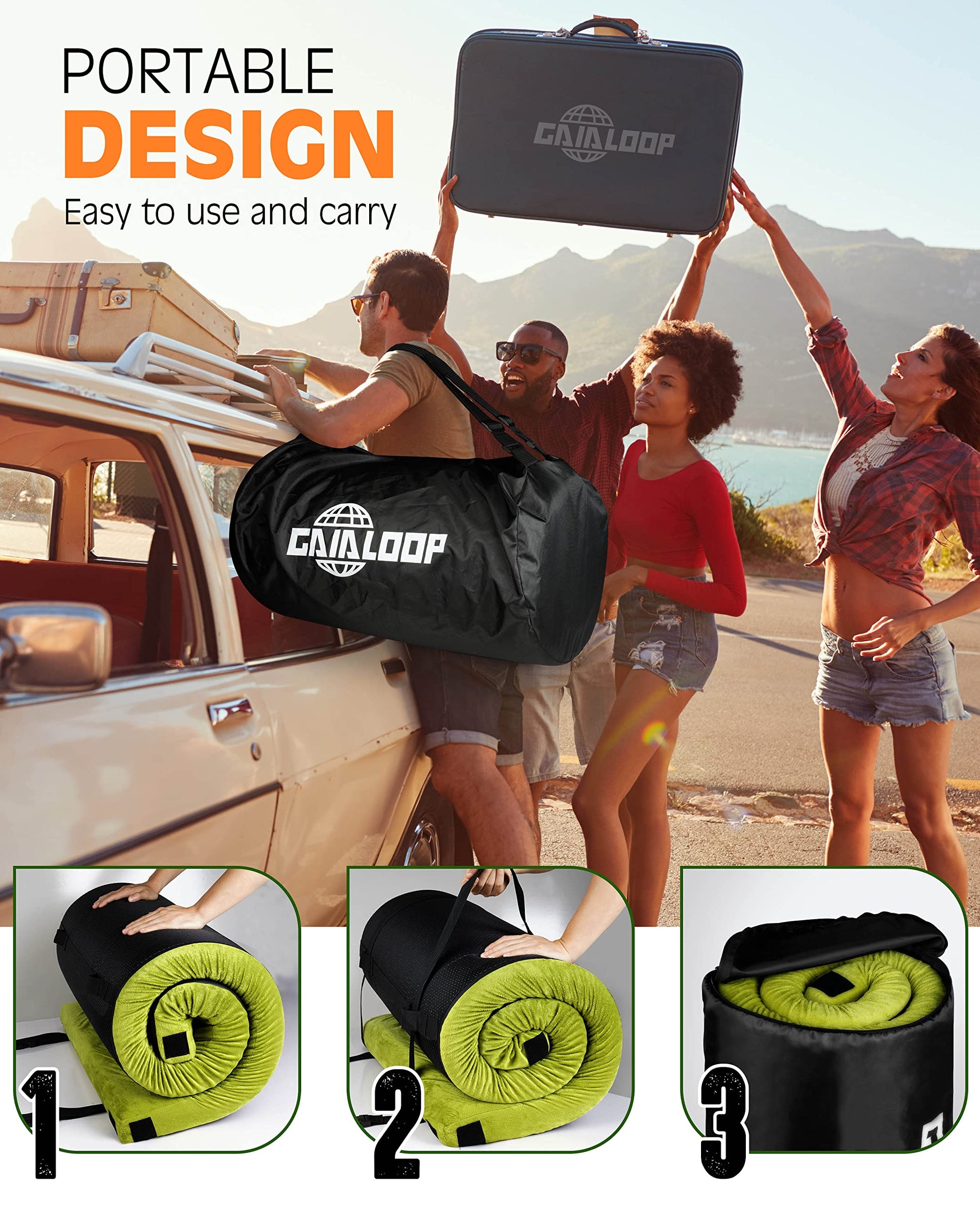 - 【Outdoor Uses: Camping/Road Trips】Outdoor, it can be used as a portable travel mattress, camping bed roll, a temporary bed in tent camping, car camping, and road trips(SUV/RV/Van/Truck/Camper). Way more comfortable and easier to use than air mattresses. It also can be used to soften up a cot or a couch. It comes with a sturdy carrying case with straps, can be rolled up nicely for storage.【Not for long-distance backpacking/hiking.】