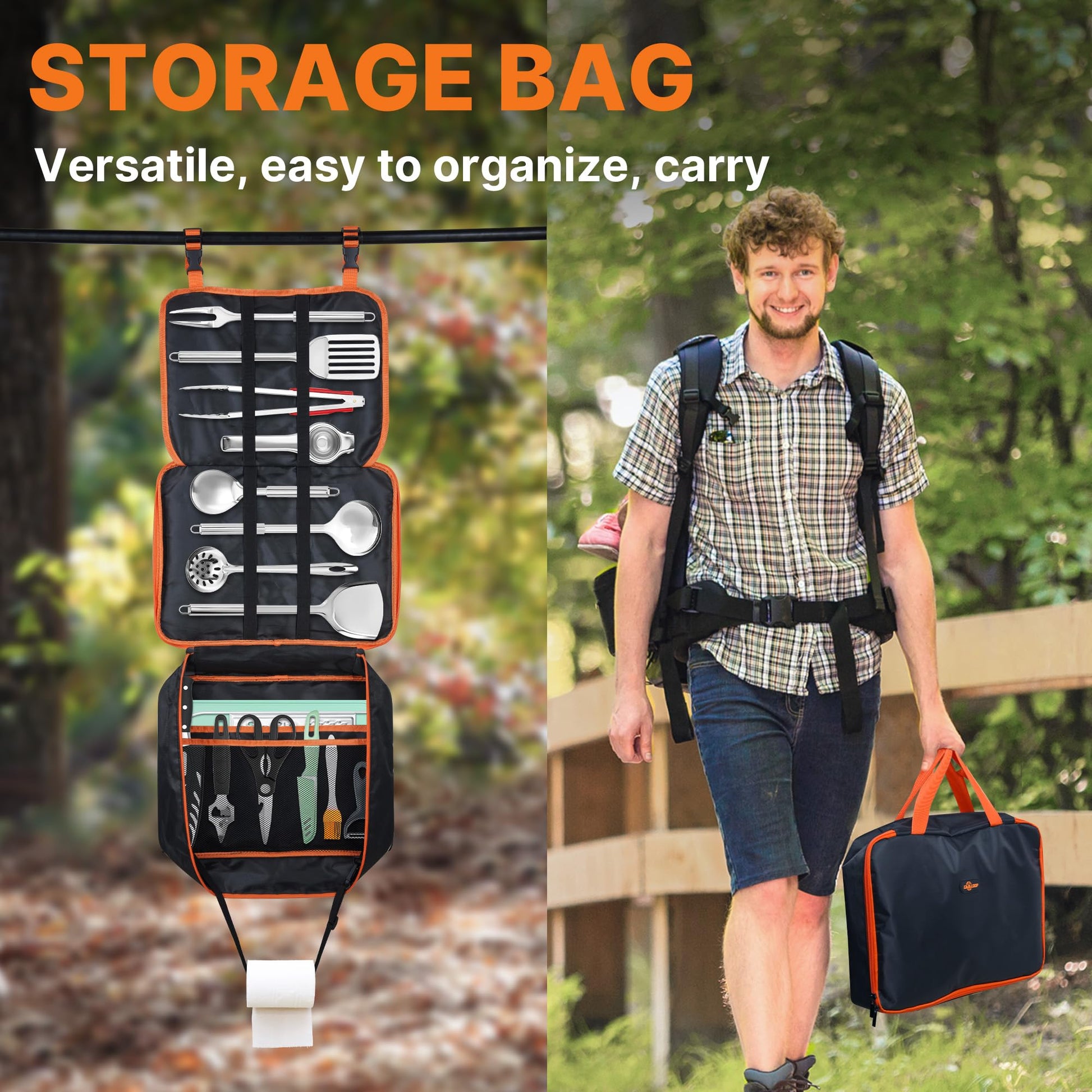 - 【Large Space Organizer Bag】This utensils set comes with a nice large space carrying bag made of Oxford Cloth. It is resistant to dust and water.It's portable, convenient, and large enough to store condiment bottles.You can use it to keep your own utensils, personalize you own cooking kit. A great gift for people who enjoy cookouts.