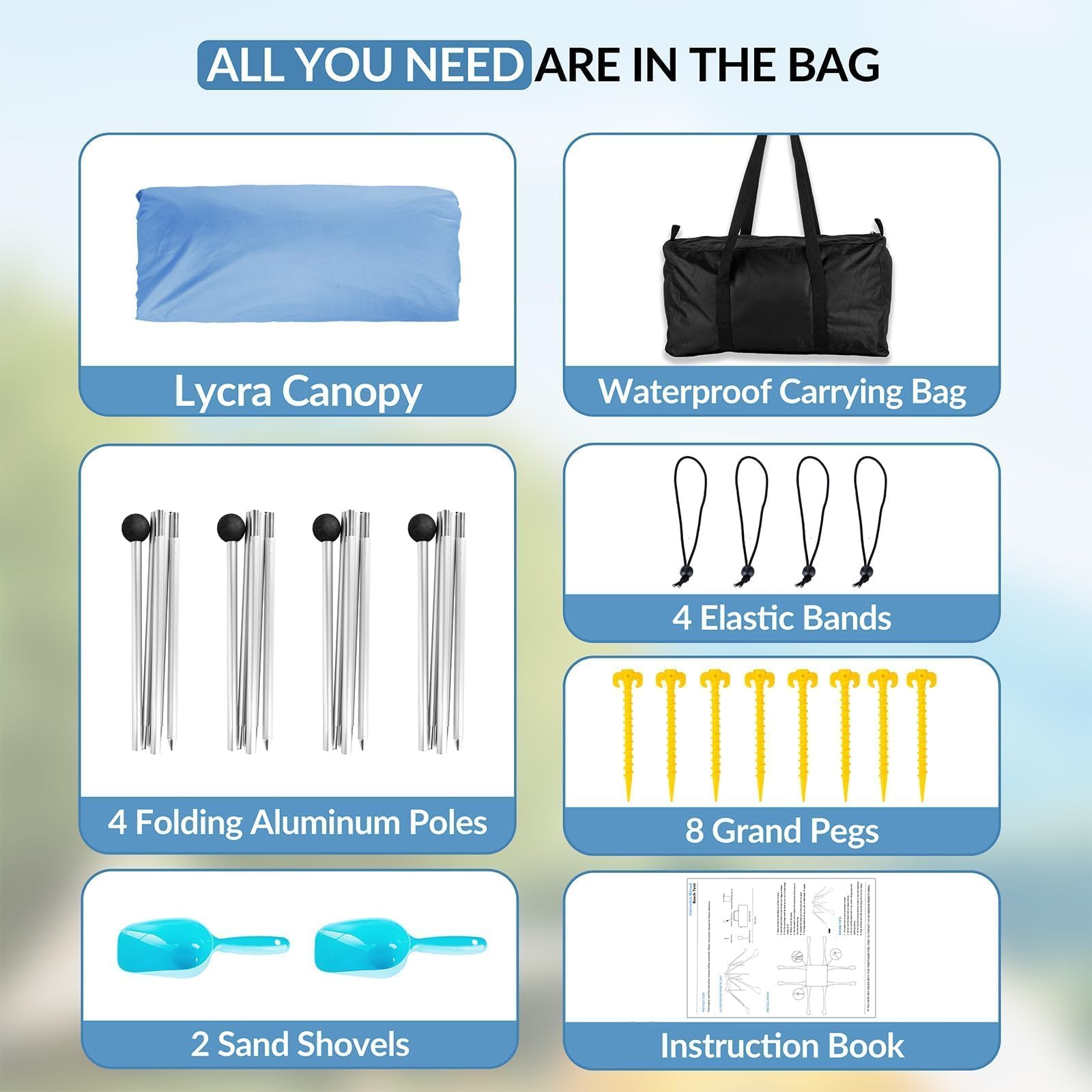 - Sun Protection High Quality Fabric: Our beach tent canopy is made of special Lycra fabric, which is waterproof, wear-resistant, highly elastic and offers excellent UPF50+ sun protection, allowing you and your family to enjoy the beach without worrying about harmful UV rays. Its special design effectively blocks out UV rays, providing you with peace of mind during outdoor activities for a long time.The tent comes in four bright colors for you to choose from, blue, navy blue, turquoise,orange.