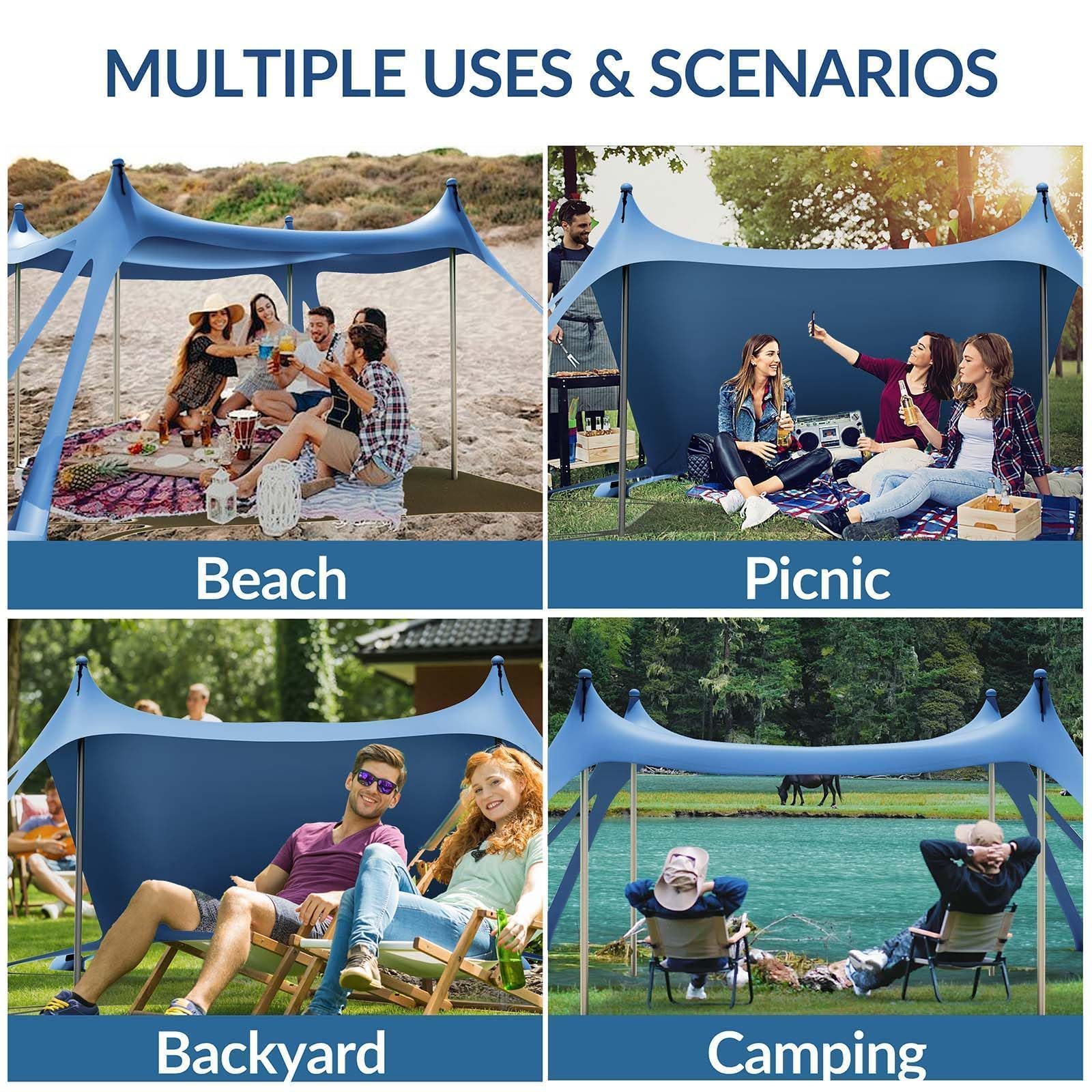- Portable and Multi-functional: Take all your accessories with you wherever you go with the portable carrying bag provided, and it's lightweight!Besides being a beach canopy, it can also serve as shelter for outdoor picnics, or camping.It can also be installed in the backyard, park, lawn, terrace, etc. to enjoy this moment of relaxing leisure time.Our multi-functional beach tent canopy is designed to meet your needs.It’s a great choice to experience outdoor activities with family friends.