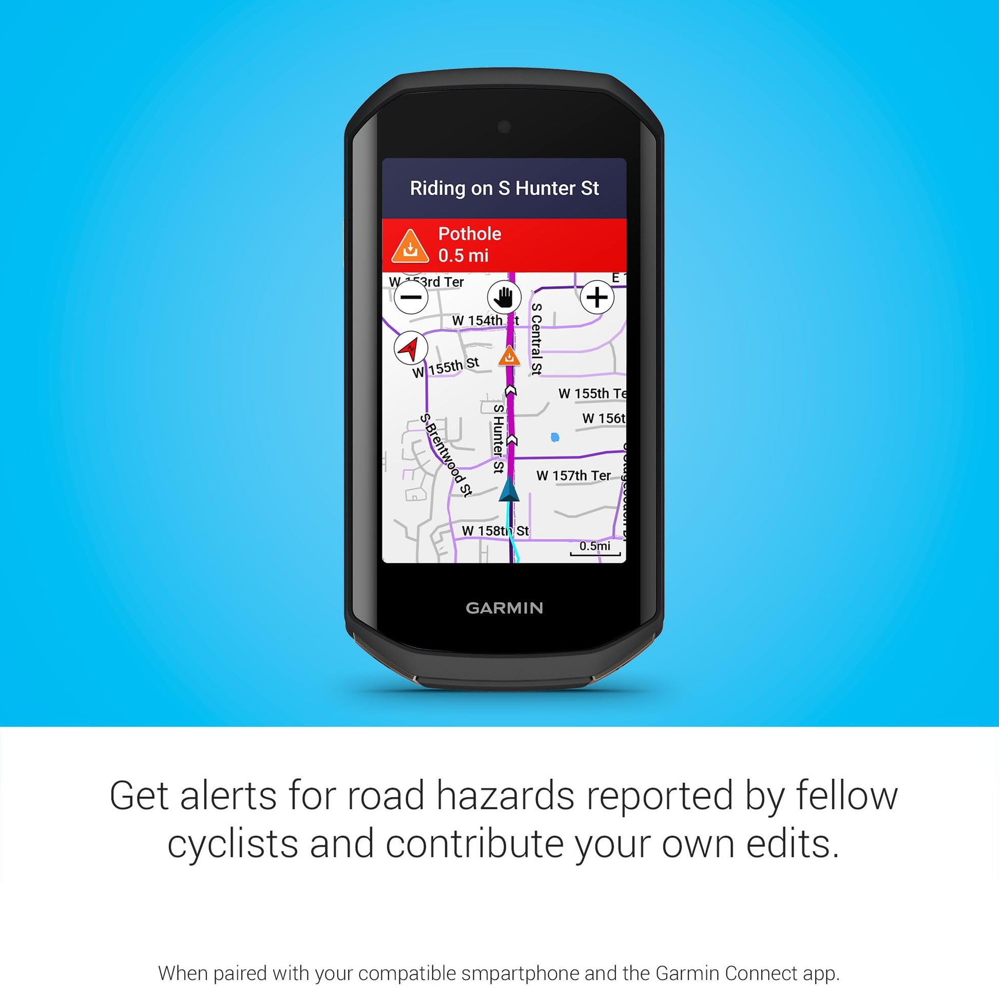 - Get alerts for road hazards reported by fellow cyclists, and contribute your own edits (when used with your compatible smartphone)