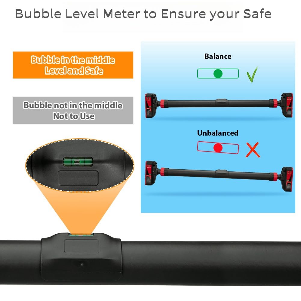 - BUBBLE LEVEL METER: Equipped with level meter, through the middle position of the bubble to judge that the pull up bar is in a level state or not. (Note: The correct installation method is that the arrow of the lever points upwards and the horizontal liquid bubble is balanced).