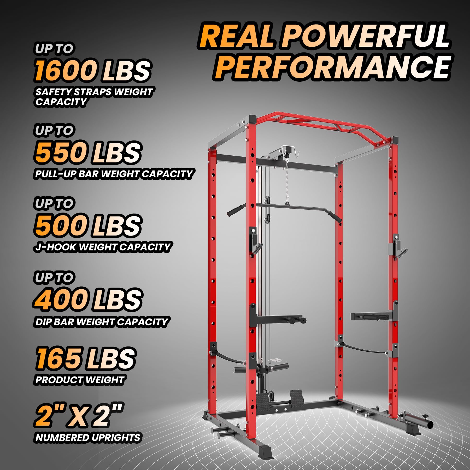 GarveeLife Power Cage with LAT Pulldown, Multi-Functional Power Rack with Cable Pulley System and J-Hooks, Squat Rack with Dip Bars and Landmine Attachment, Weight Cage for Home Gym Equipment
