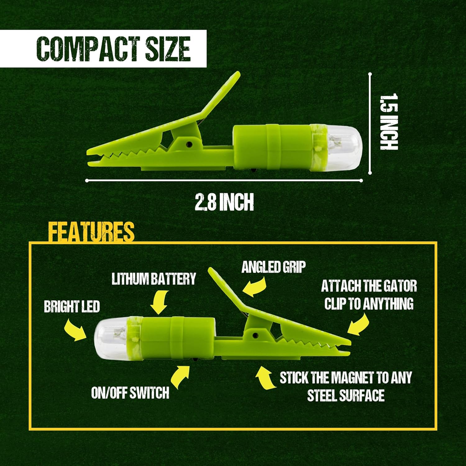Gator Eyes are the practical solution to all your lighting needs. These lights come with a gator clip and a magnet for use in every situation! Place a pack in your tackle box, blind bag, deer hunting pack, tent, boat, ice house, truck, toolbox, or anywhere a light might be needed. The bright LED will brighten up every situation. For hands-free use, clip the Gator Eyes on the bill of your hat, fishing poles, tree branches, or any object with the gator clip, or stick the magnet to tools, the fridge, or any metal object.