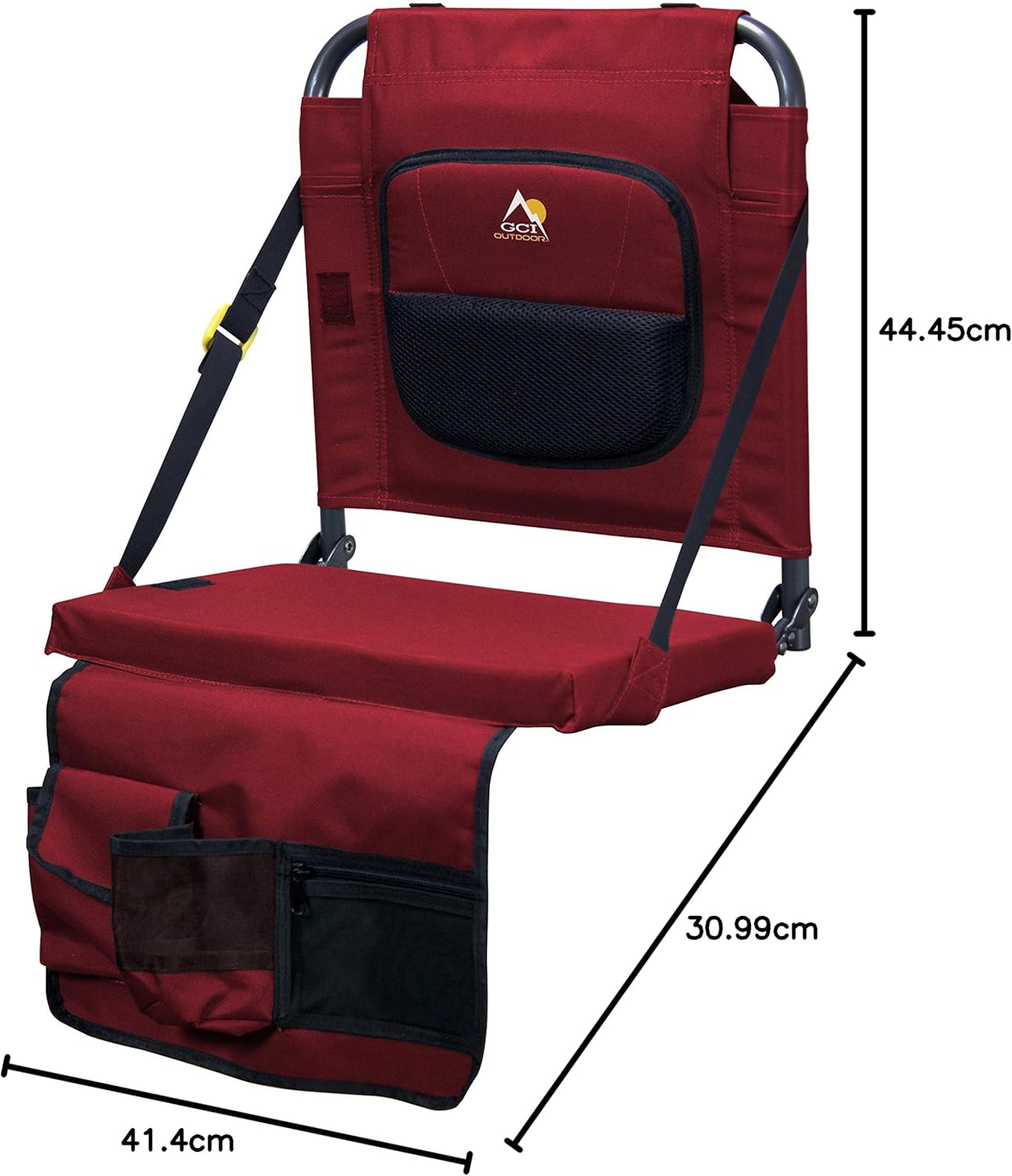 The GCI Outdoor BleacherBack Lumbar Stadium Chair is the answer to uncomfortable bleacher and bench seating at sporting events, concerts, and other outdoor venues. Ergonomically designed with a supportive backrest, this portable seat provides support and comfort even if the game goes into overtime. The sturdy powder-coated steel frame accommodates up to 250 pounds, and measures 12.2 x 16.3 x 17.5 inches, providing maximum space within the allotted size of a stadium seat. A single-buckle strap on the bottom of our bleacher seats attaches easily and securely to bleachers and benches, so that our sports chairs for adults stay put throughout the game or concert. Lightweight and portable, the GCI Outdoor BleacherBack Lumbar Stadium Chair folds down to 16.3 x 16.3 x 3.3 inches, and weighs just 3 pounds, making it easy to transport from the tailgate to the game. Limited lifetime warranty.
