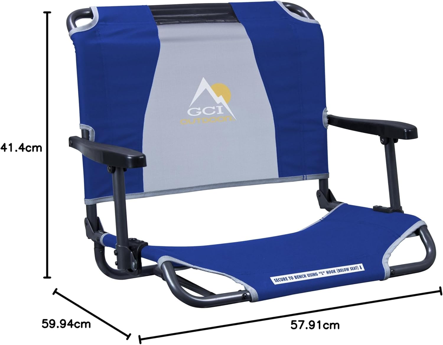 - Stadium seat features an integrated L-shaped hook that attaches easily and securely to bleachers and benches at stadiums and concert venues