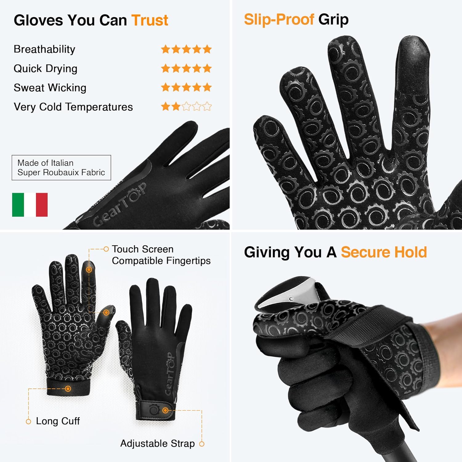 - Touchscreen-friendly tips in the index finger and thumb to smoothly navigate your device|Stretchy Super Roubaix provides a snug but non-restrictive fit|Stay warm and cozy during chilly runs as you sport these gloves|Breathable and quick-drying gloves that reduce sweat buildup|Gripping circles in the palm for a solid grasp|Versatile running gloves are also great for hiking cycling driving etc.|Adjustable Velcro straps keep these running gloves securely in place|Unisex running gloves for men and women|GearTop Lifetime Guarantee