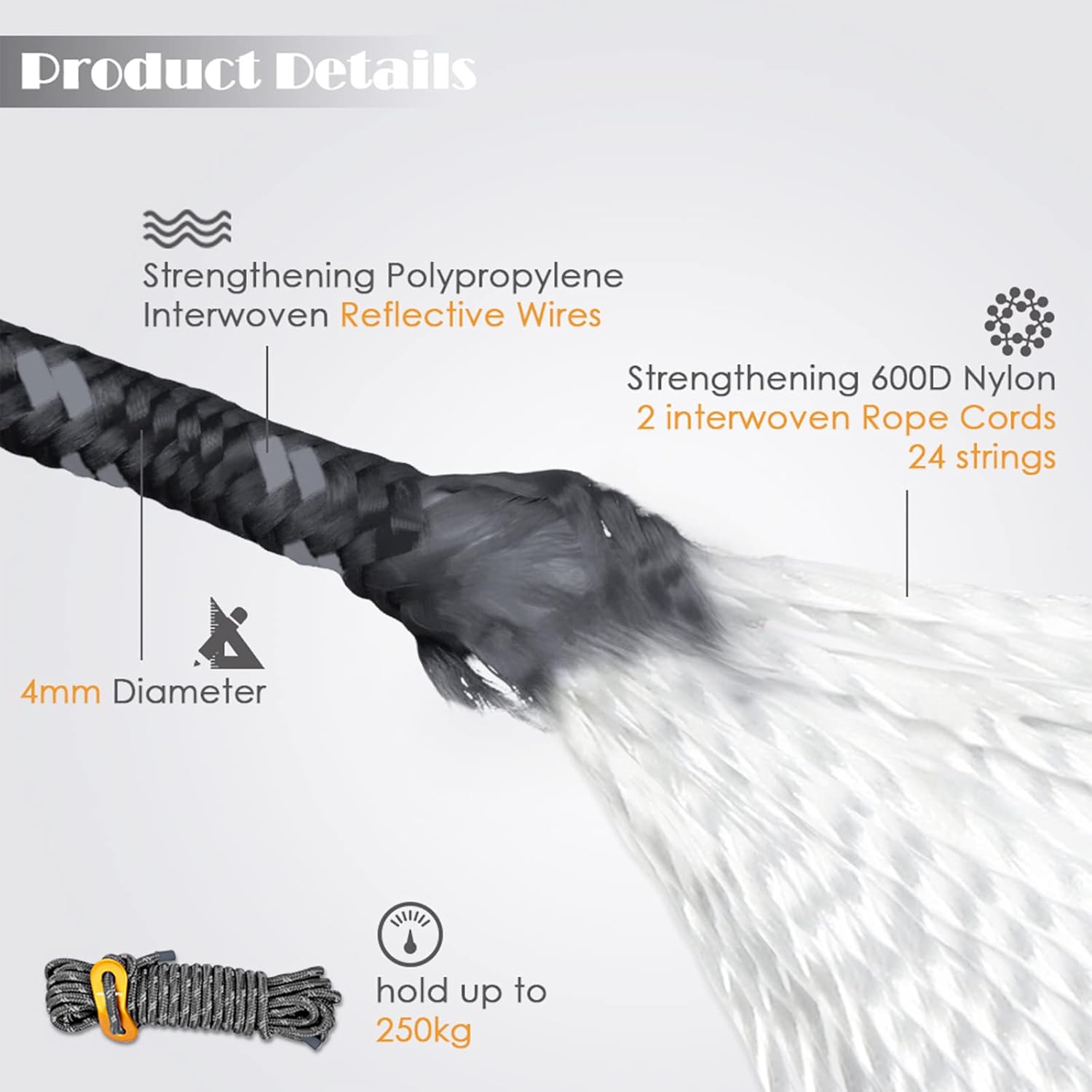 - 【Heavy Duty & Extremely Strong】 The 4 mm inner core is made from premium nylon, which can bear a load up to 551 lbs. Not easily deformed even in harsh weather conditions