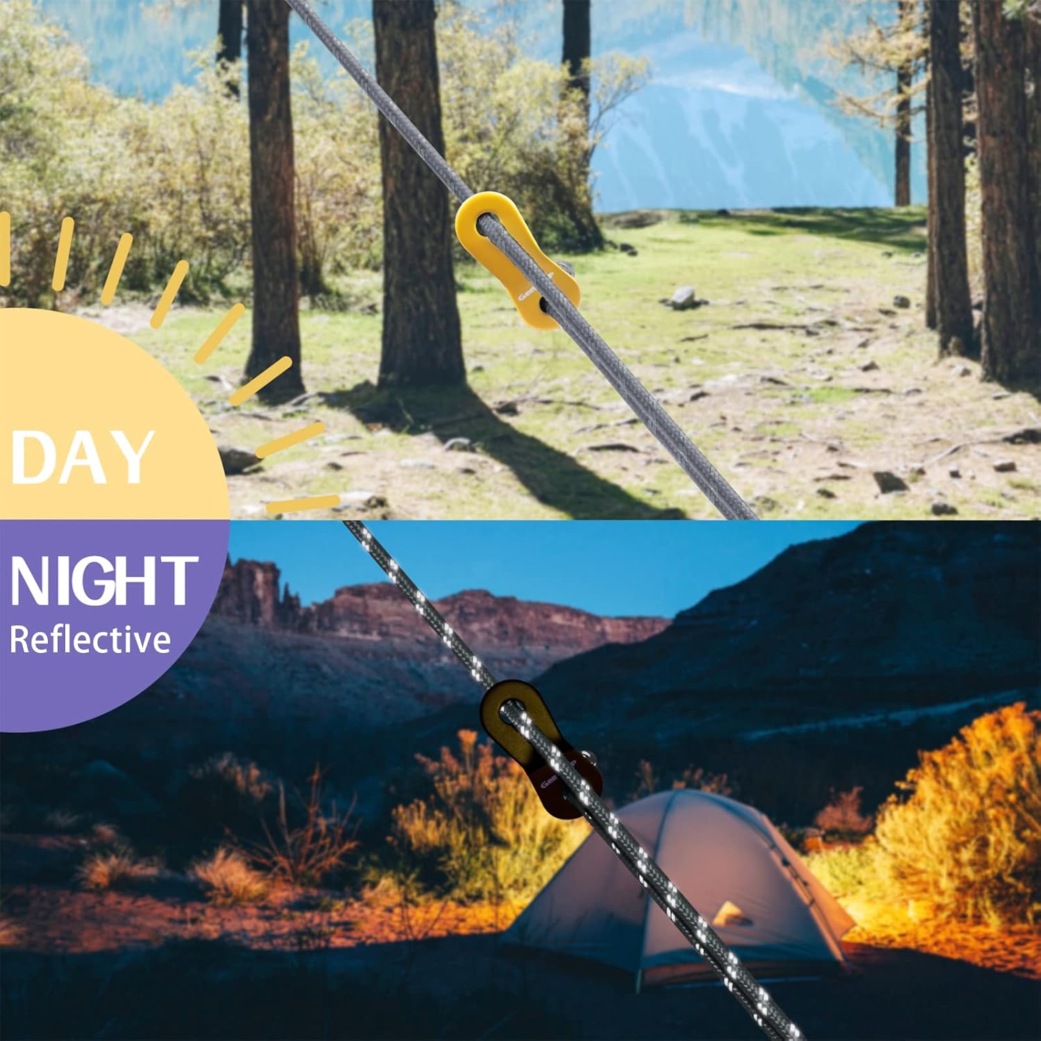- 【High Reflective Camping Ropes】4 mm highly reflective guy lines uniquely contains 2 interwoven reflective filaments, giving much greater visibility even in low light conditions, to keep safe at night