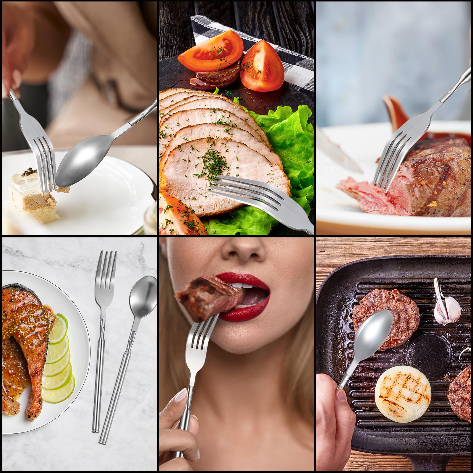 - Convenient Size: measuring at about 8.7 inches/ 22.1 cm and can be extended to 25.43 inches/ 64.6 cm for the fork, measuring at about 9.06 inches/ 23 cm and can be extended to 24.8 inches/ 63 cm for the spoon; These stainless steel forks and spoons are suitable for many eating occasions; Their size and extendable design offer convenient usage without sacrificing your comfort; Enjoy your meals with utensils that cater to a comfortable eating experience, regardless of the dish