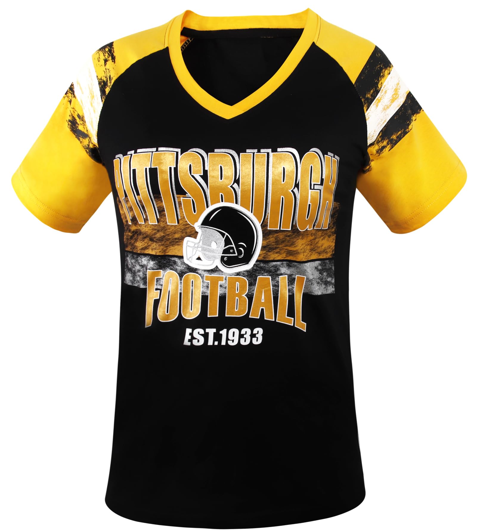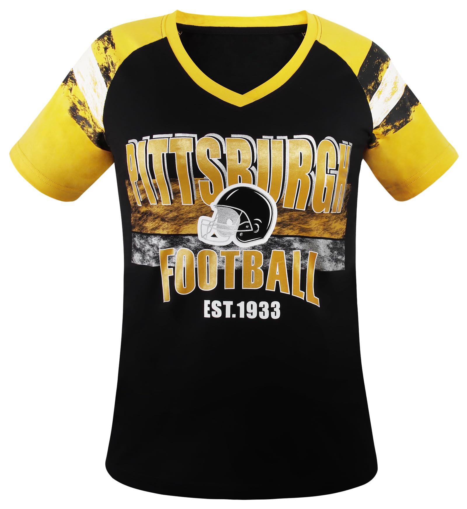Geneisteck Womens Football Fans V Neck City Raglan T-Shirts - Black & Yellow X-Large