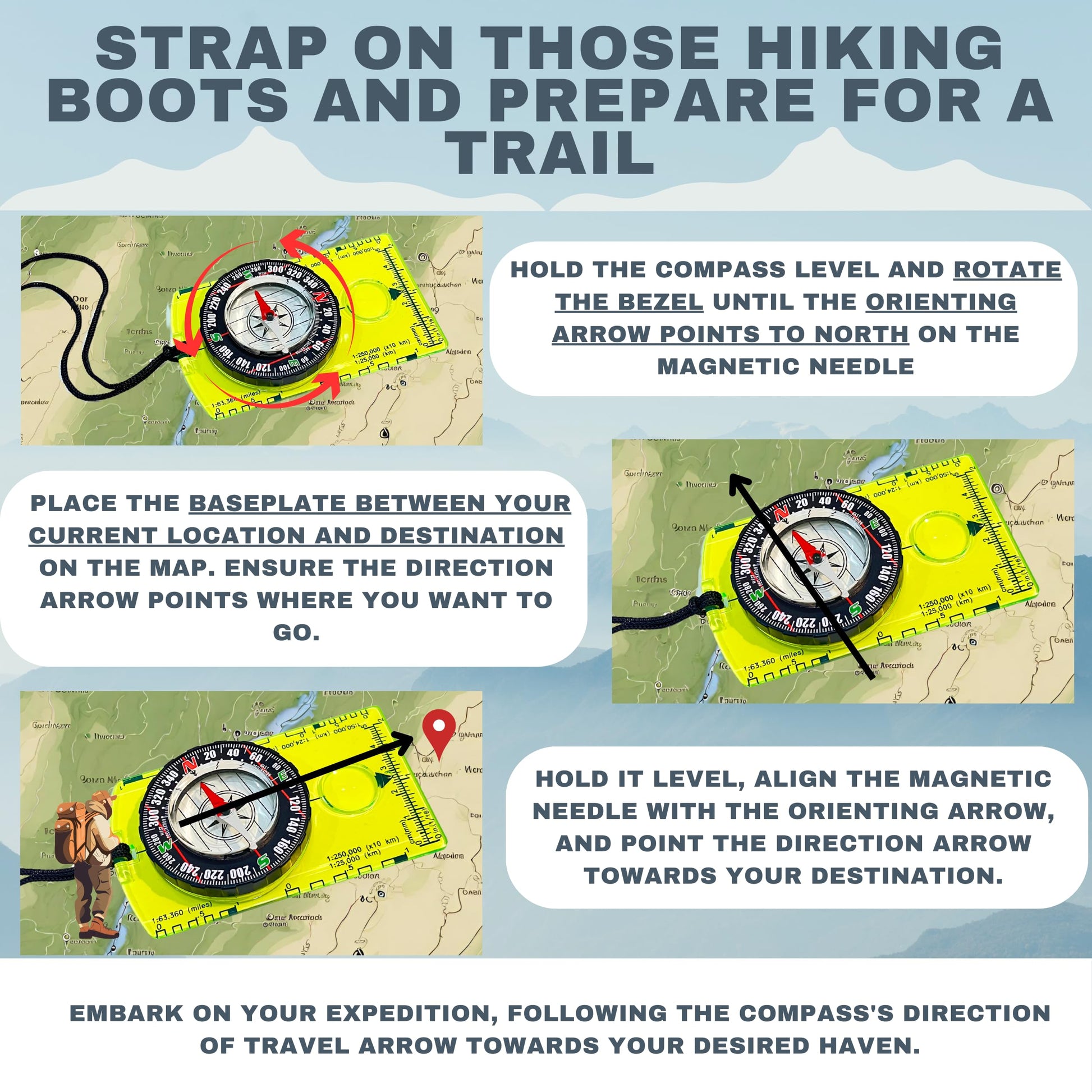 - IMPRESSIVE FEATURES: Both Compasses come with a non-magnetic Acrylic Baseplate to not intwith the magnetic needle, and have the best accuracy. The needle is placed in a bubble that allow the needle to have a quick 360 degrees rotation helping us to have a accurate and fast reading of the direccion the we have to take. Its differents Ruler Scales help the hiker to read the map more accurate. It also has a Magnifying Glass that help us to read geological maps and small details of the map.