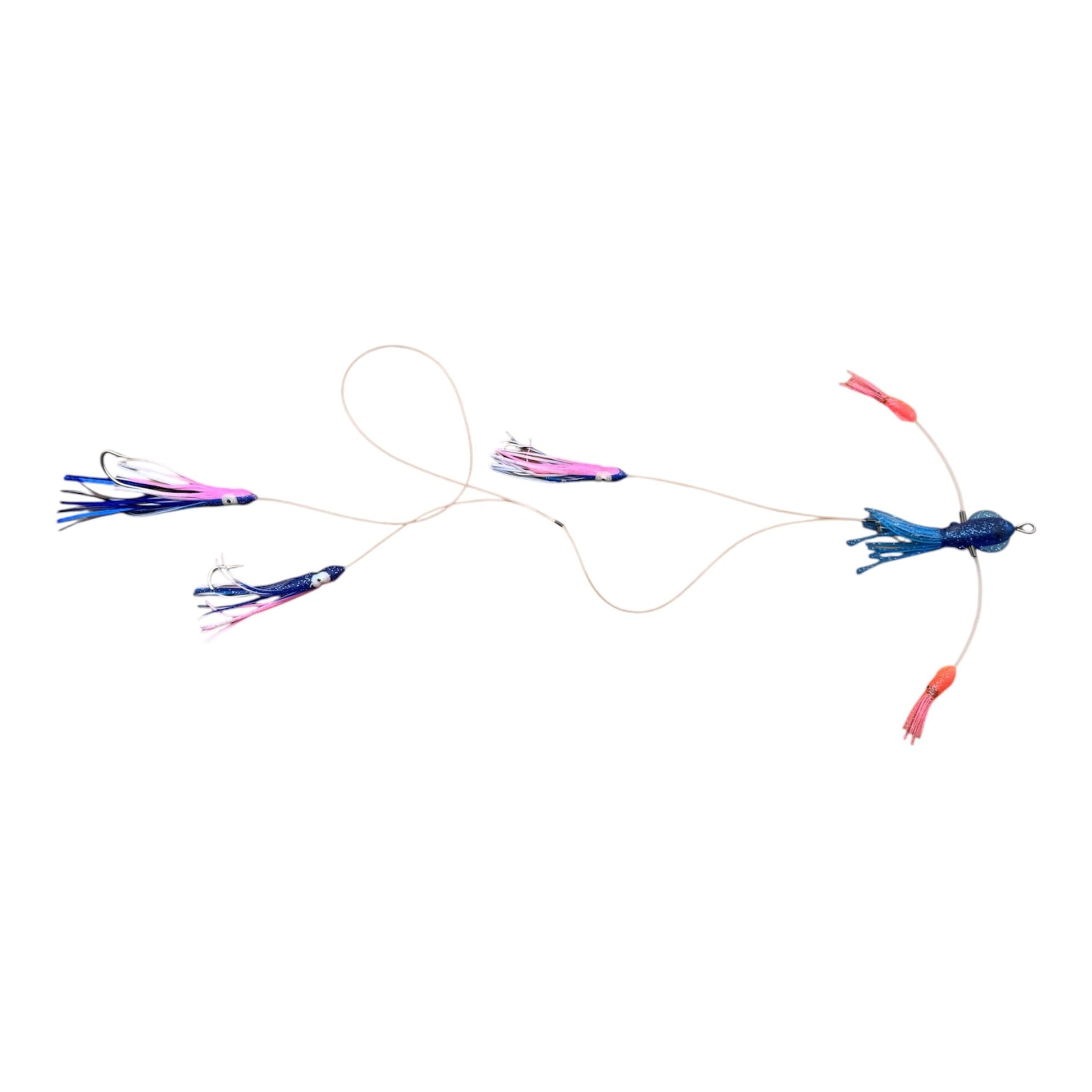 - Works as its own teaser with mini “Flippy Floppy” in the front, behind the front portion are 3 BWC 4.5″ squids with 7/0 hooks, each on its own drop
