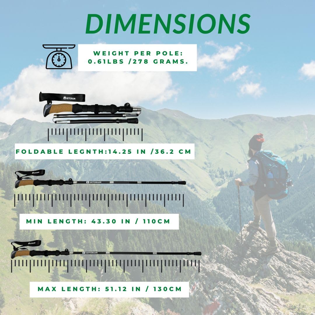 GETORIUM Trekking Poles - Lightweight, Folding Hiking Poles for Backpacking Gear, Nordic Ultralight Walking Sticks, 2 Poles, Aluminum 7075, 110-130cm, Cork Grip