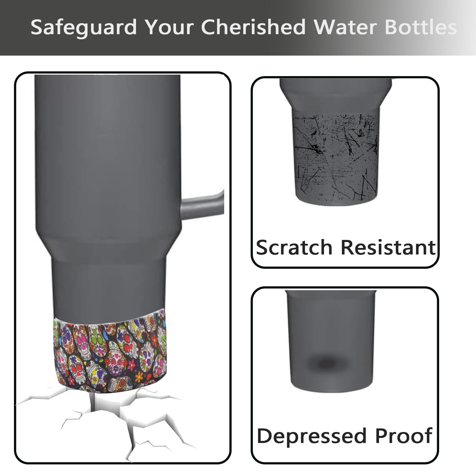 hazards, but they also add a pop of punk rock to your water bottle with a vibrant and colorful skull pattern. The boots are crafted from strong, safe, food-grade silicone free from BPA, designed to face any challenge while preserving the sleek appearance