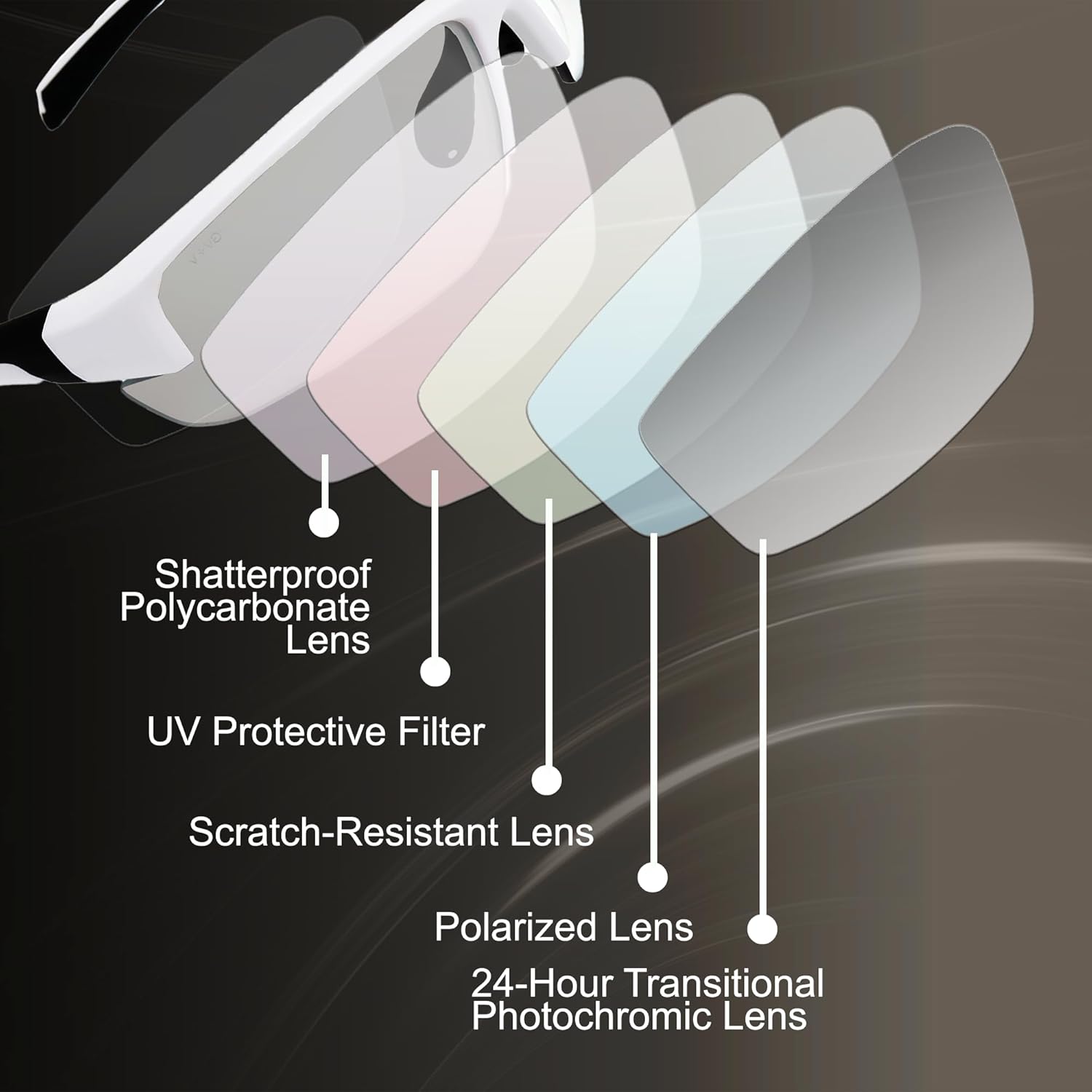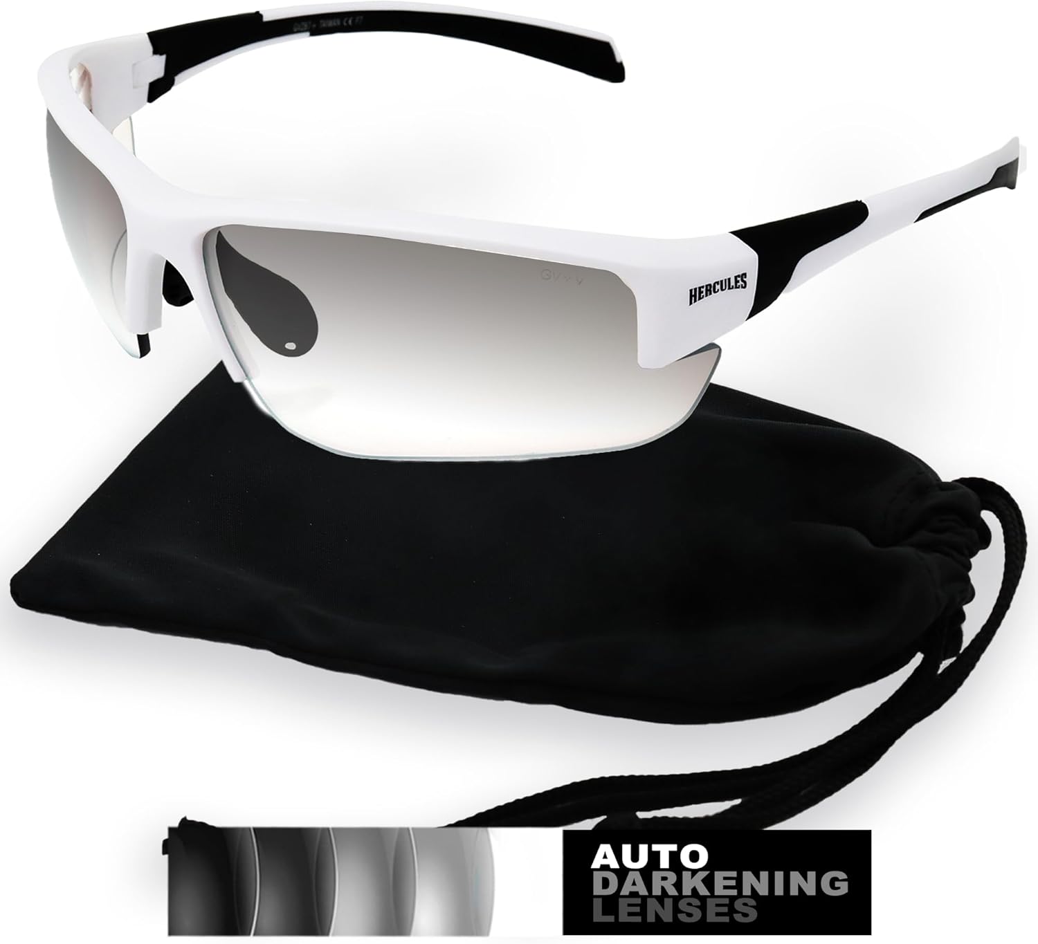 - Photochromic safety sunglasses with auto-darkening lenses that adjust from clear to smoke for bright and low-light conditions