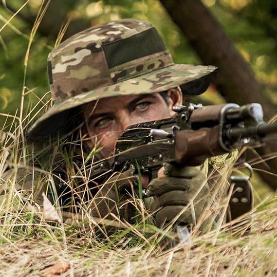 - 【2】Hat size: one size fits most adults. Unique brim design to protect you from sun and sand. Very practical and classic decoration sewn webbing around crown designed to hang something in your wargame.