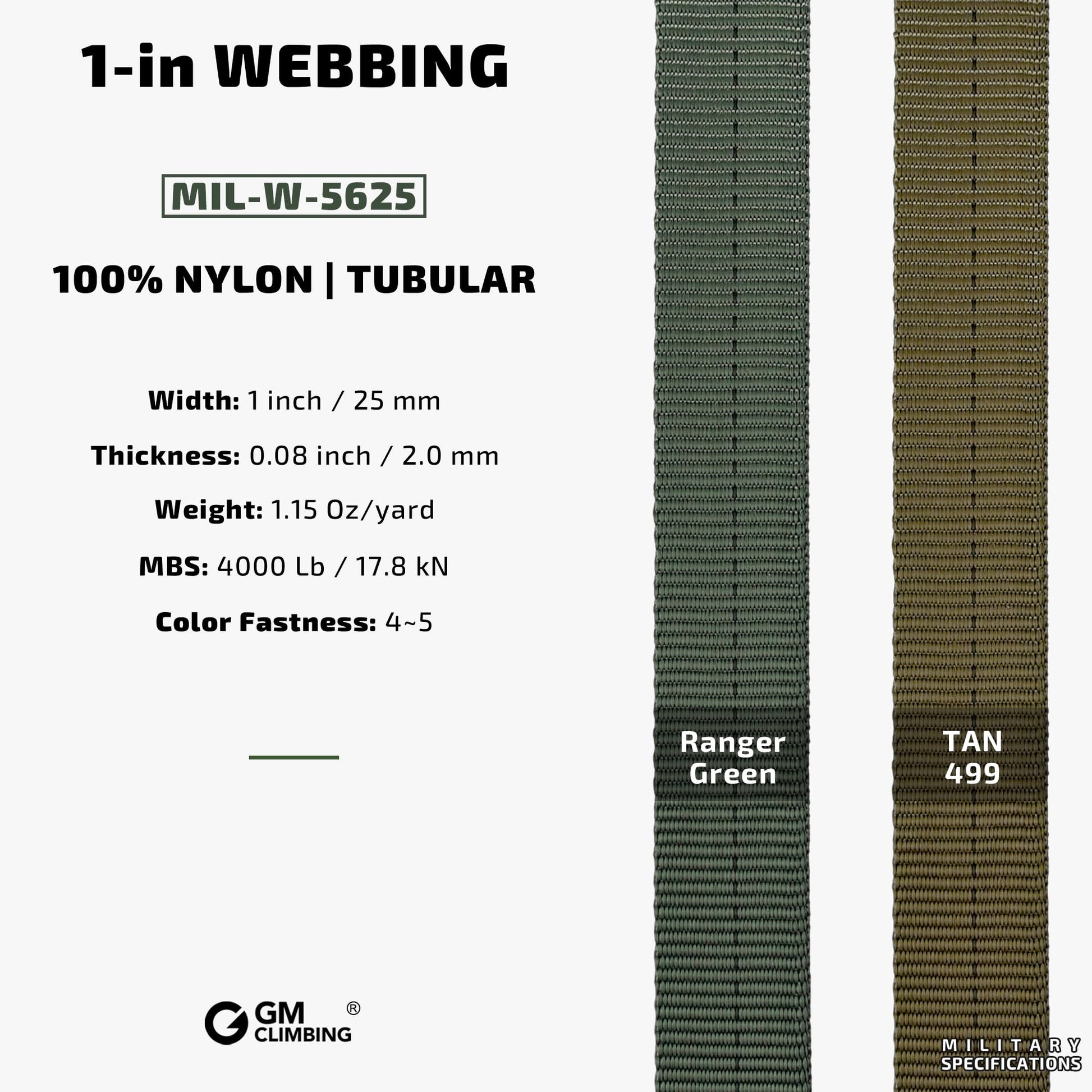 - MIL-W-5625 Milspecs Nylon Tubular Webbing by GM CLIMBING, 1 inch wide to withstand over 4000lb / 17.8kN breaking strength, made out of 100% nylon 6.6 for excellent durability and toughness. Favored by climbers, rescue specialists, and outdoorsmen in the military, parachute, and tough outdoor applications, making a wide variety of straps, slings, anchor systems, tactical gears, parachute static lines, shot bags, heavy-duty tie-downs, lashing, and more.
