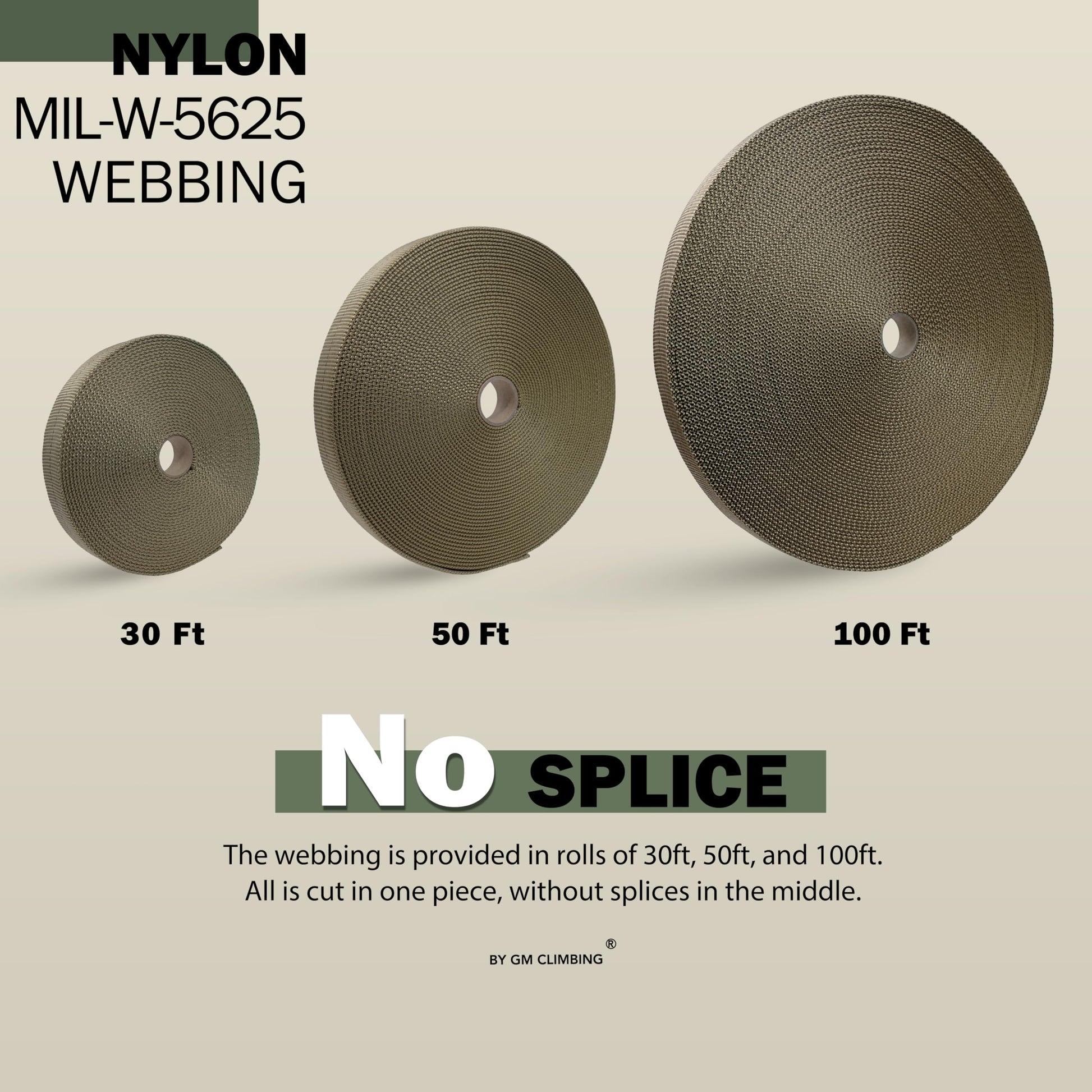 GM CLIMBING 1 inch MIL-W-5625 Nylon Tubular Webbing Milspecs 4000Lbs Durable for Outdoor Tactical Parachute Climbing Rescue Survival Tie Down 1 inch x 50Ft Tan 499