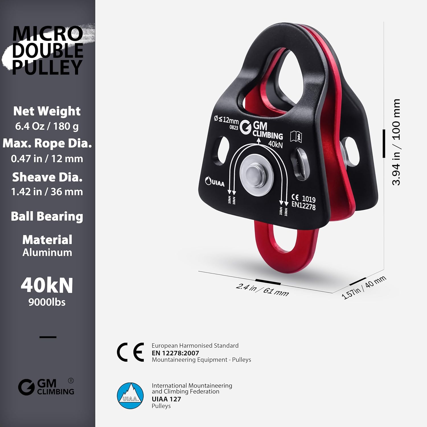 - 40kN Micro Double Pulley by GM CLIMBING, serves to create compact 4:1 or higher 5:1 mechanical advantage systems. Light, compact, and durable, Prusik-minding, compatible with ropes up to 12mm, CE and UIAA certified. Commonly employed for self-rescue, emergency hauling and dragging in mountaineering, as rappelling backups, for slackline tensioning, rigging in tree climbing, and more demanding scenarios.
