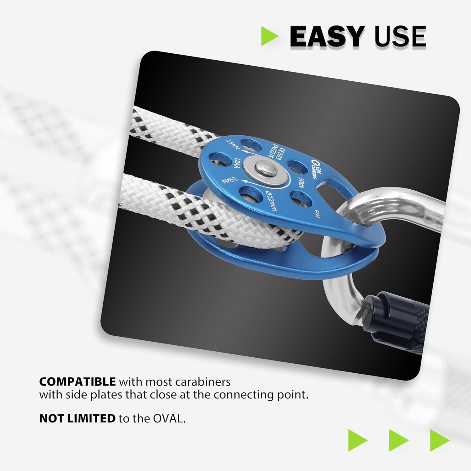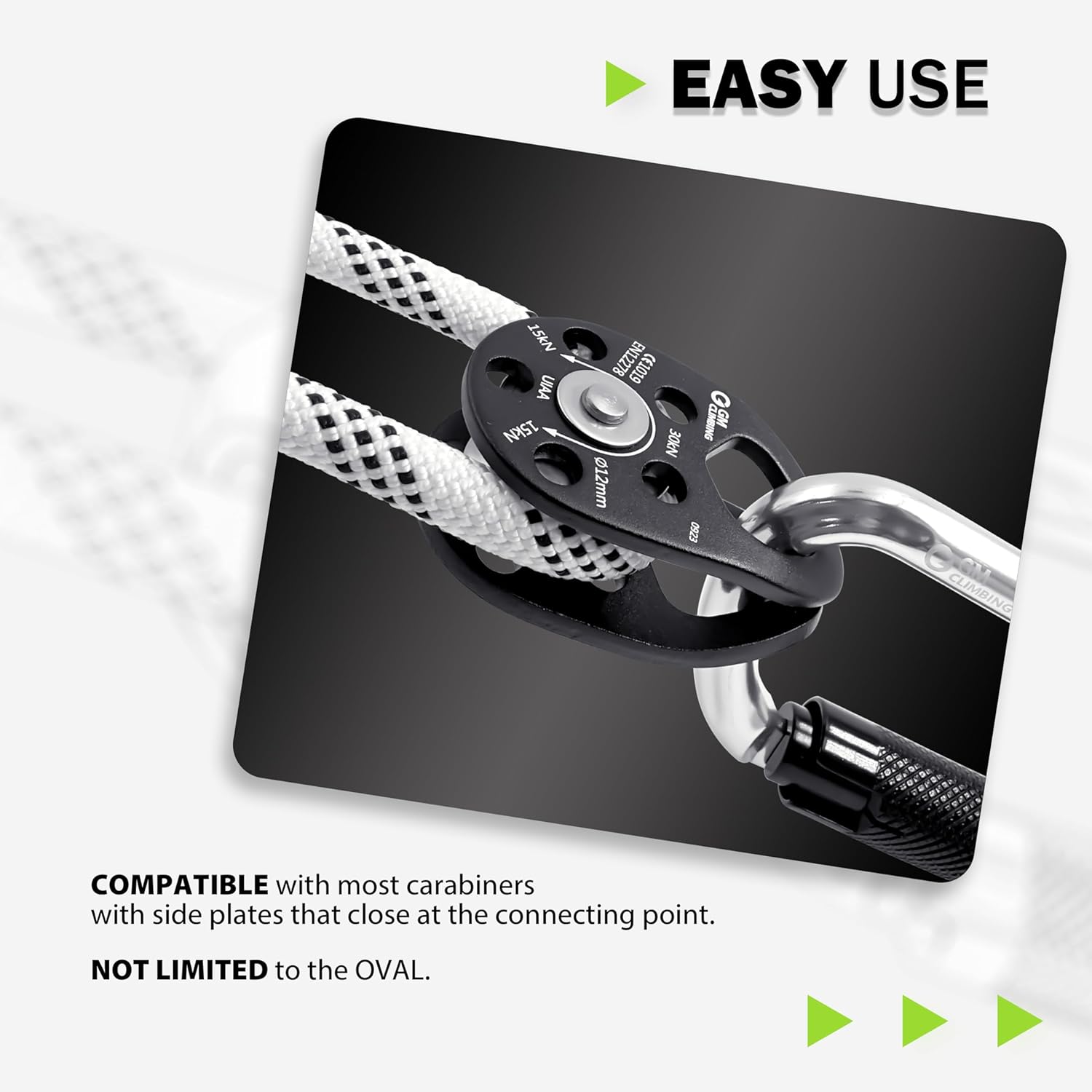 - 【EASY USE】The side plates feature a full 360-degree rotation to allow for easy opening. Installing the pulley anywhere on the rope is a swift process, and it can also be easily removed whenever needed. The side plates are curved to stay closed on the top connecting point. The pulley can accommodate carabiners of various shapes, not limited to the oval shape. Additionally, the curved plates provide ample space inside, allowing the rope to slide smoothly through.