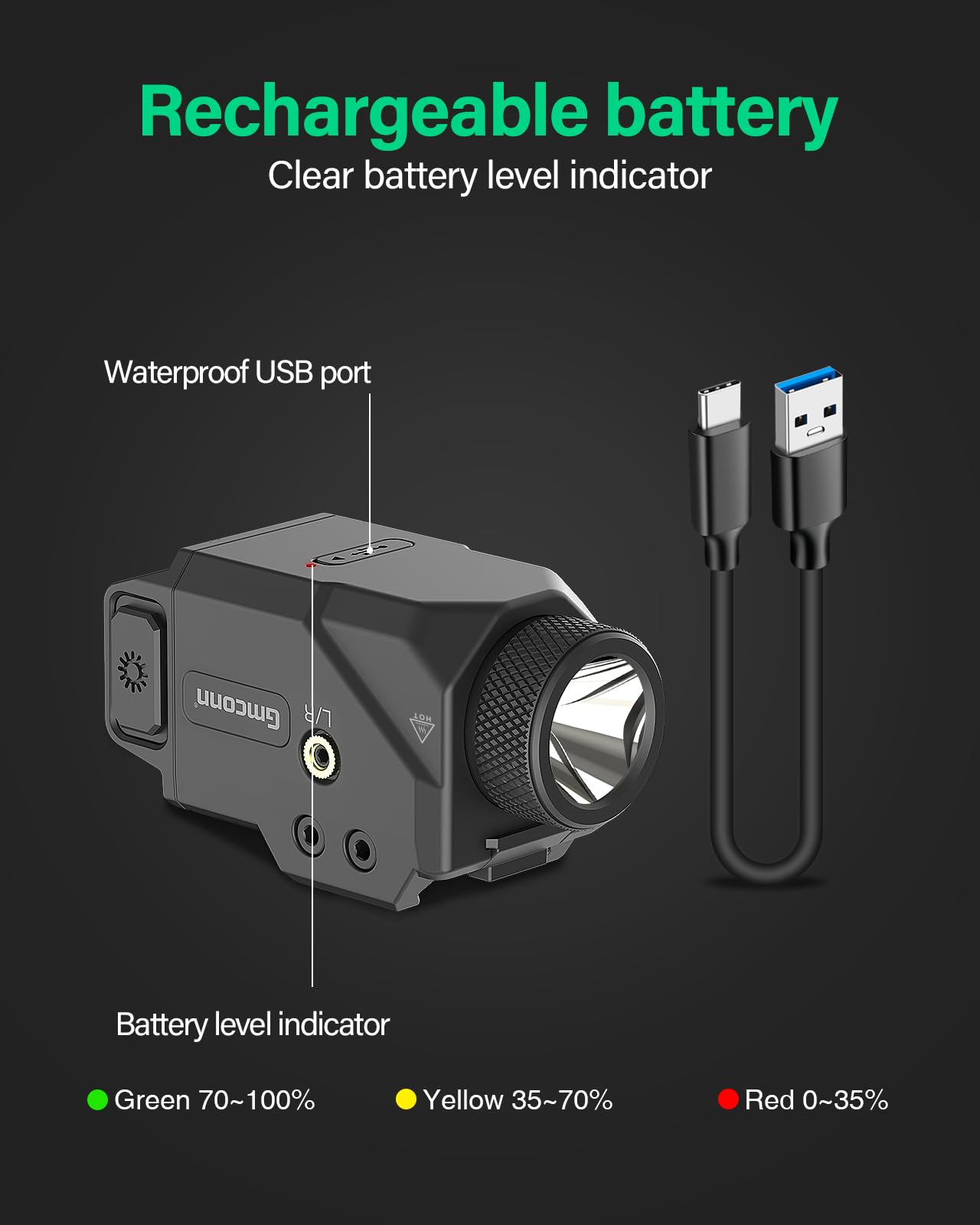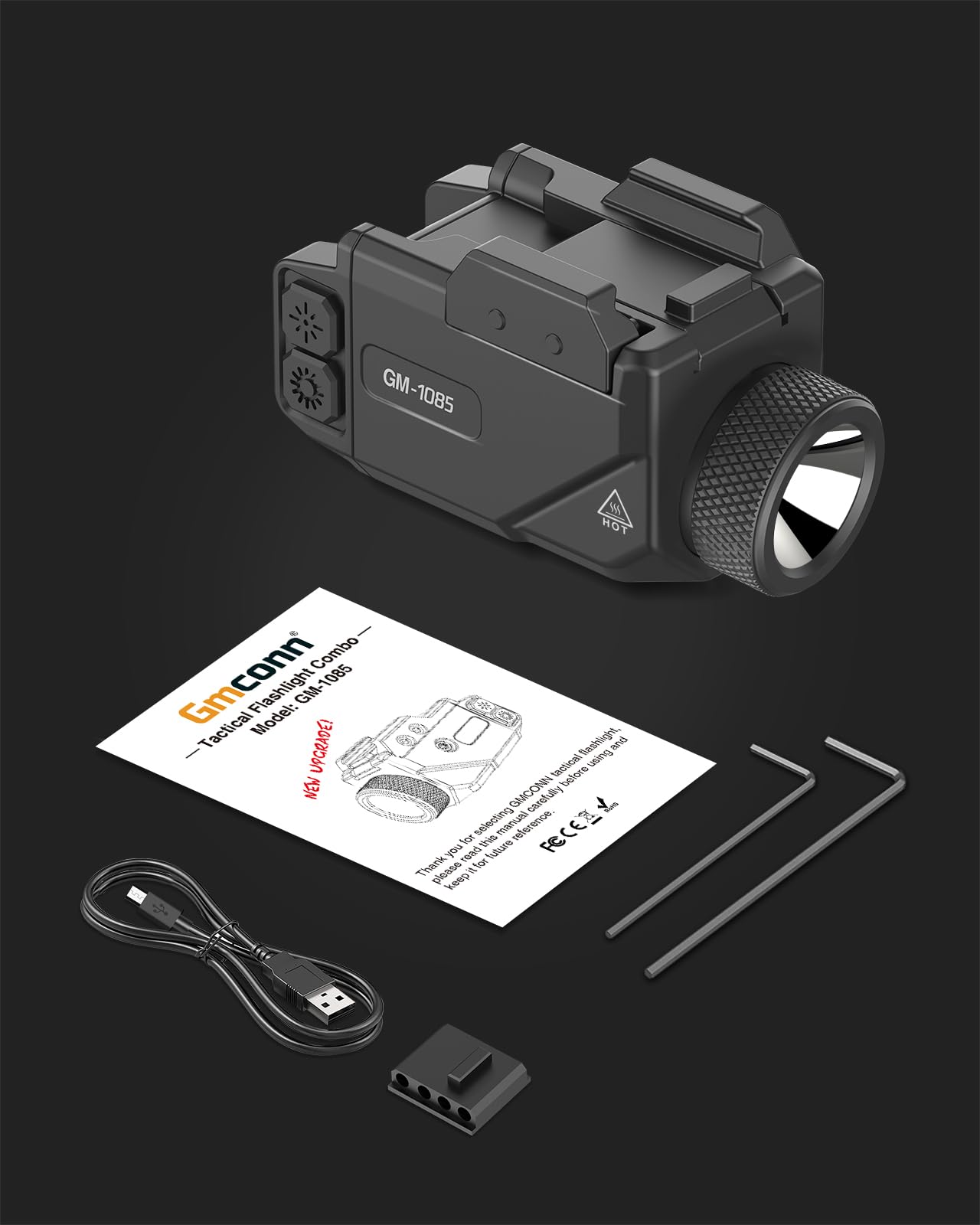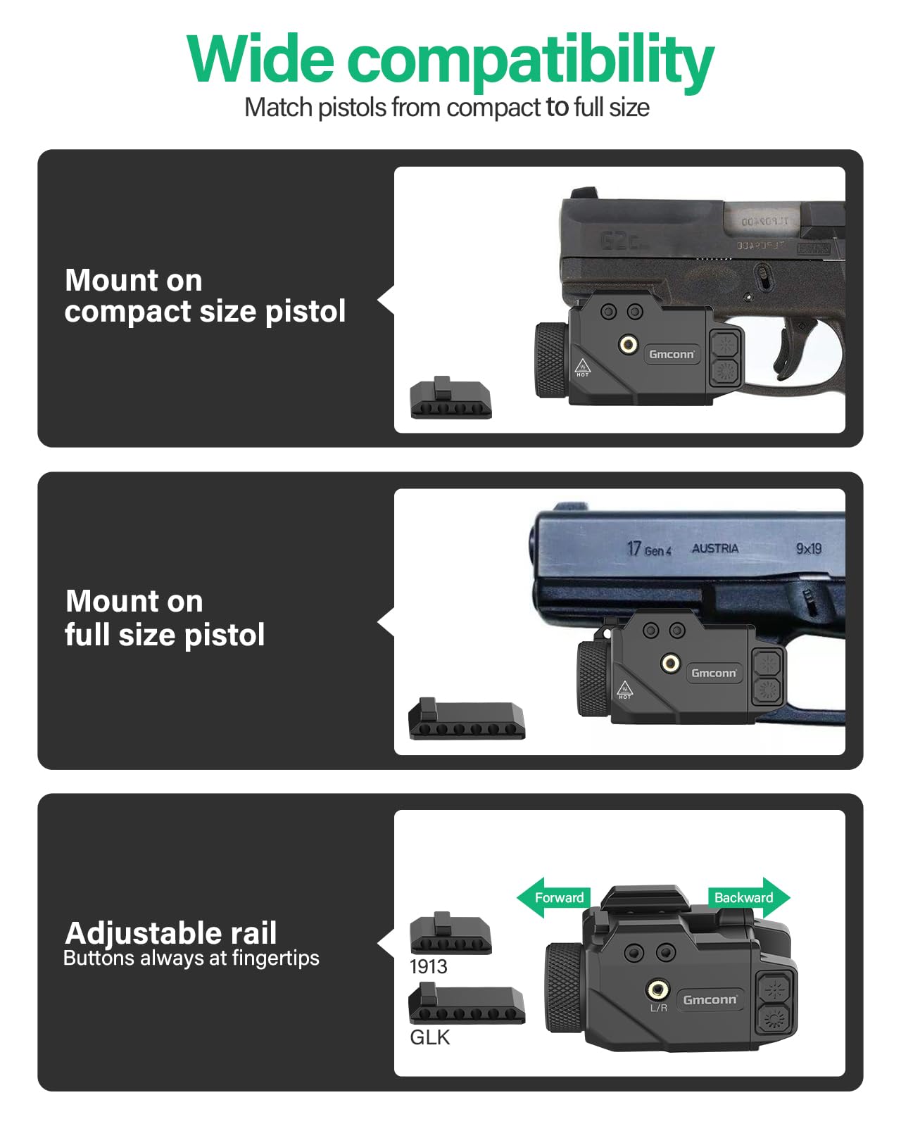 - Ajustable Rail System: GM-1085 flashlight laser combo for pistols adopts the adjustable rail system, which allows it to perfectly fit different kind of pistols.