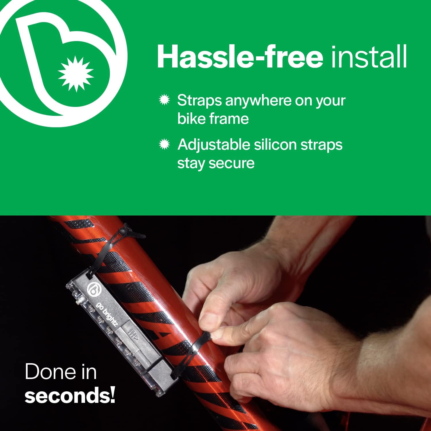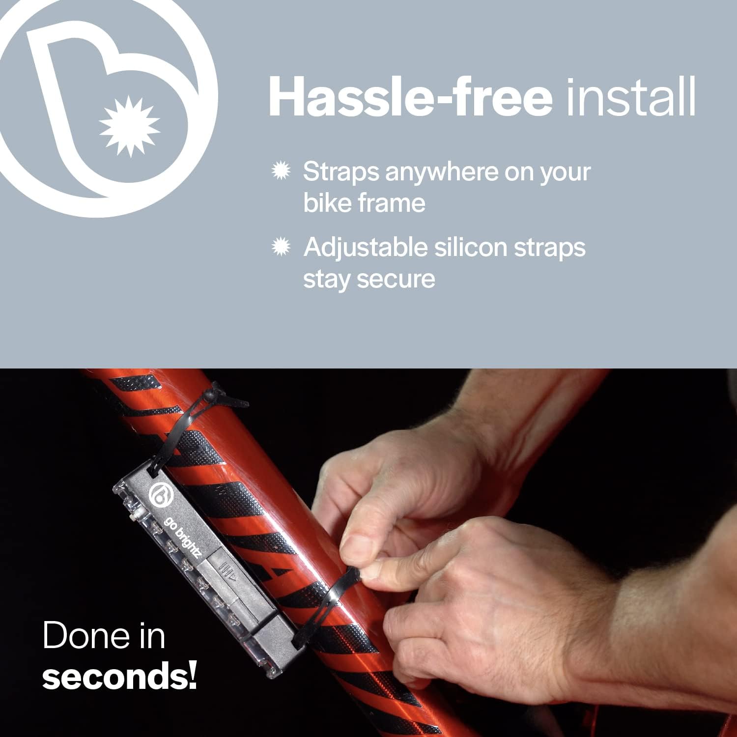 - BIKE FRAME LIGHT BAR – a high-intensity LED light that mounts to your bike frame our Go Brightz bike lights make it easier for you to be seen while riding bikes at night in the city or park providing safety while also enhancing the look of your ride