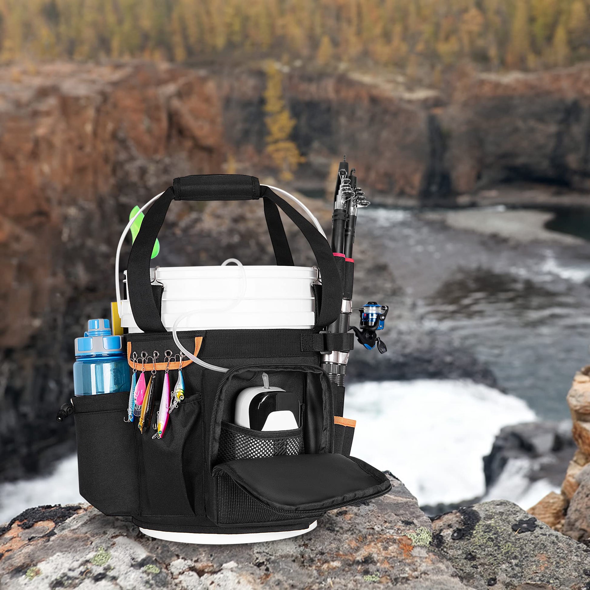 - Quality Material: This fishing bucket caddy is made of quality 600D nylon material. The padded handle makes it easy to carry and providing comfort carrying experience. The organizer bag can fold flat to save more space when not in use