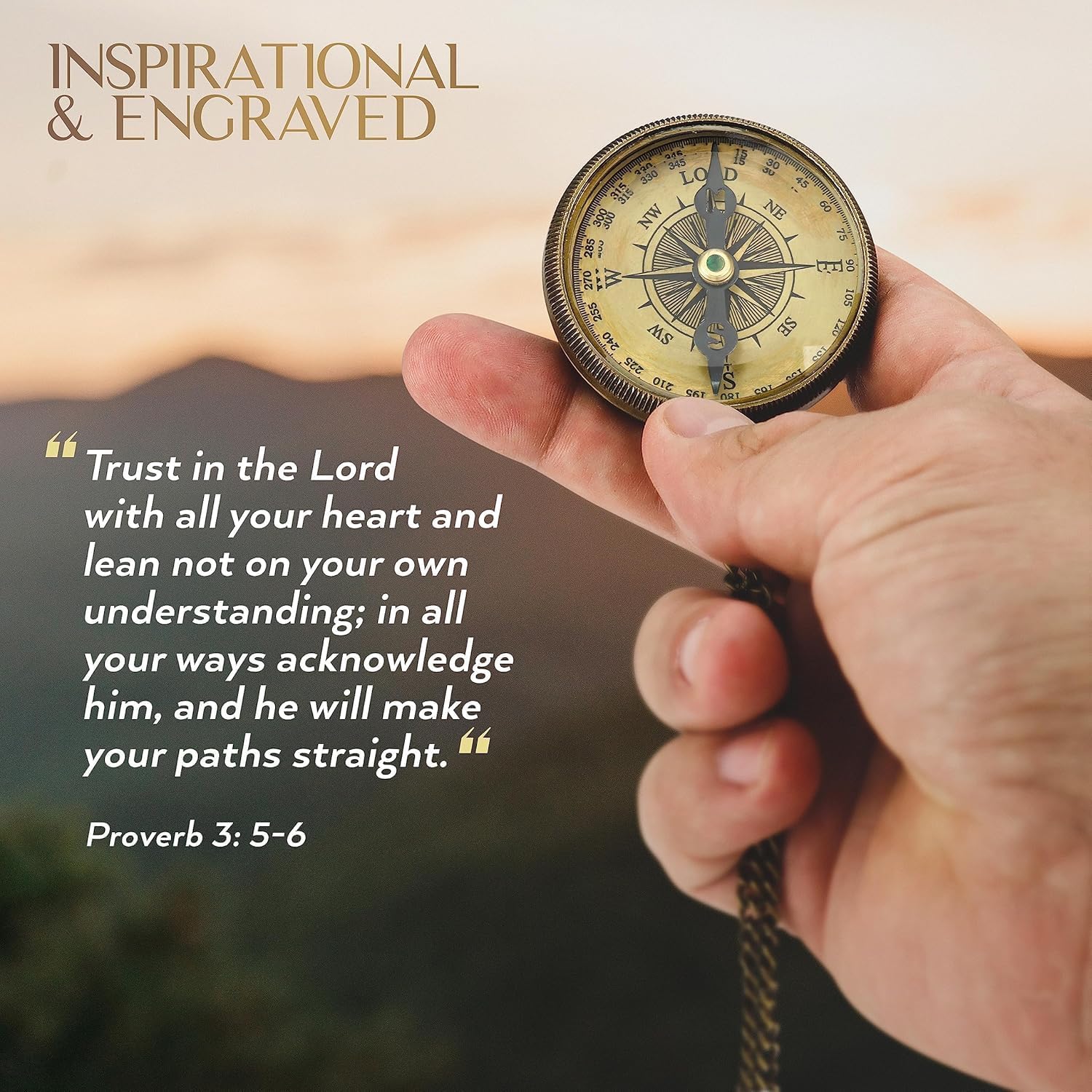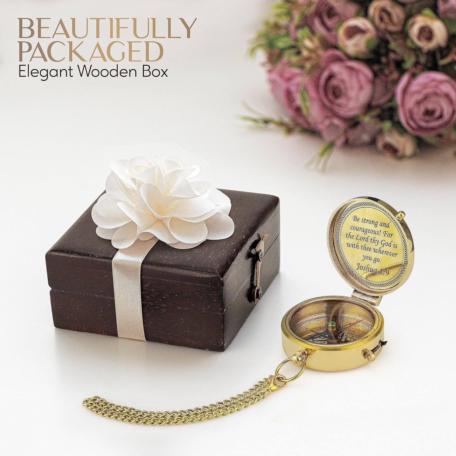 - Inspirational Inscription - Engraved on the reverse side is the inspirational scripture from Joshua 1:9 (“Be Strong and courageous! For the Lord thy God is with the wherever you go”) & it serves as a means to remember the Lord always and to keep our focus on Him--our Guide & True North. Over 2 inches in diameter our compass hangs beautifully on the included 6 inch gold display