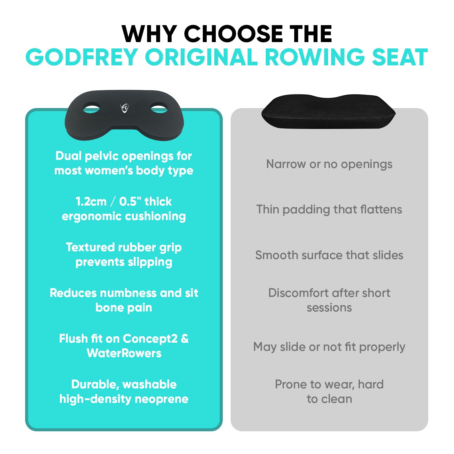 - DESIGNED FOR WOMEN – Godfrey’s premium rower seat pad is tailored to fit the natural shape of the female body with pelvic bone cutouts placed at a wider position for better support and comfort. The outer contours fit perfectly with your rowing seat.