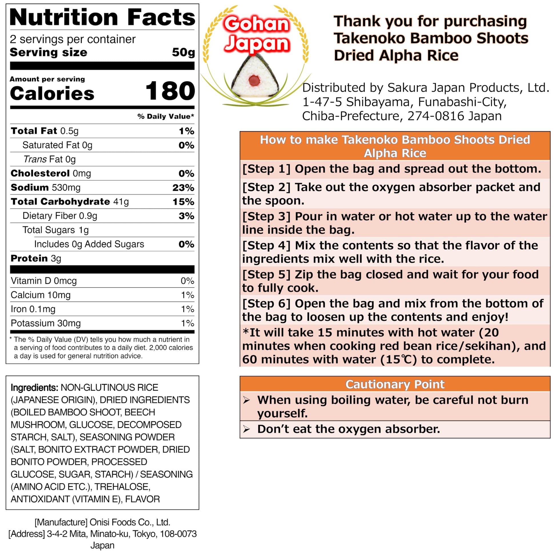 - ✅ GOHAN JAPAN Takenoko Bamboo Shoots Dried Alpha Rice (100% Japan-based) 100g/3.5oz (A filling 260g/9.2oz meal) per 1-pack manufactured by Onisi Foods (Japanese Company)