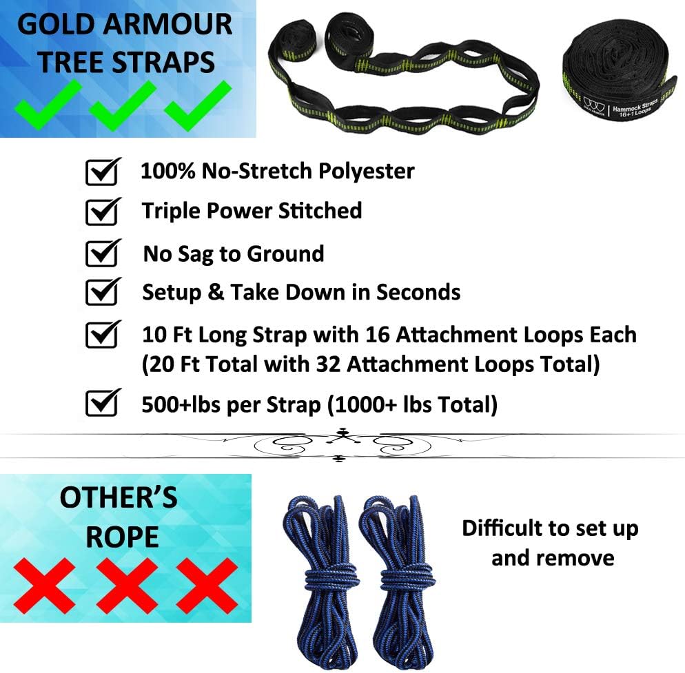 Includes two heavy duty carabiners and two tree straps 10 Feet Long (20 Ft Total) x 1 Inch Wide (Tree Friendly) that make setting this up both fast an extremely simple for even the most novice user