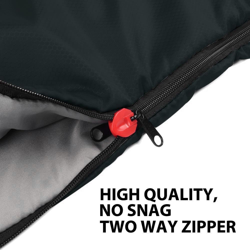 HIGH QUALITY ZIPPER - No snag zipper helps ensure you can easily and quickly, zip yourself into your sleeping bag. Convenient double sided zipper also allows for closure while lying inside.