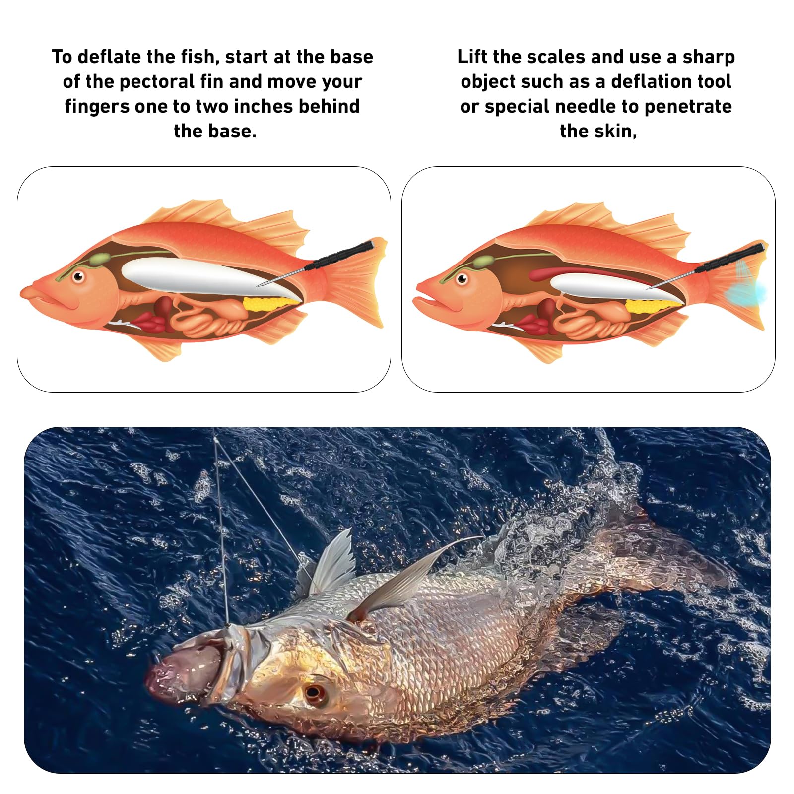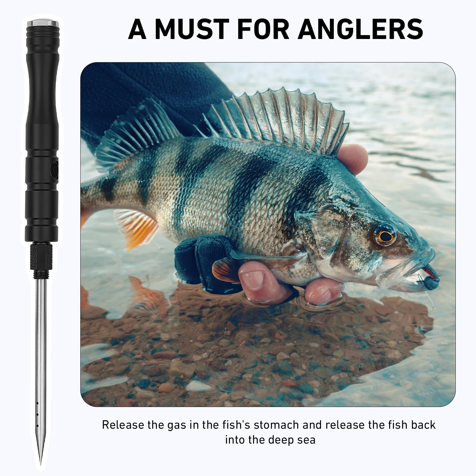 - Easy to Use:Find the Correct Position of The Swim Bladder. Lift the Scales and Pierce the Skin at a 45-Degree Angle with the Venting Tool. The Resulting Wound is Small, Ensuring the Fish's Survival Rate After Release