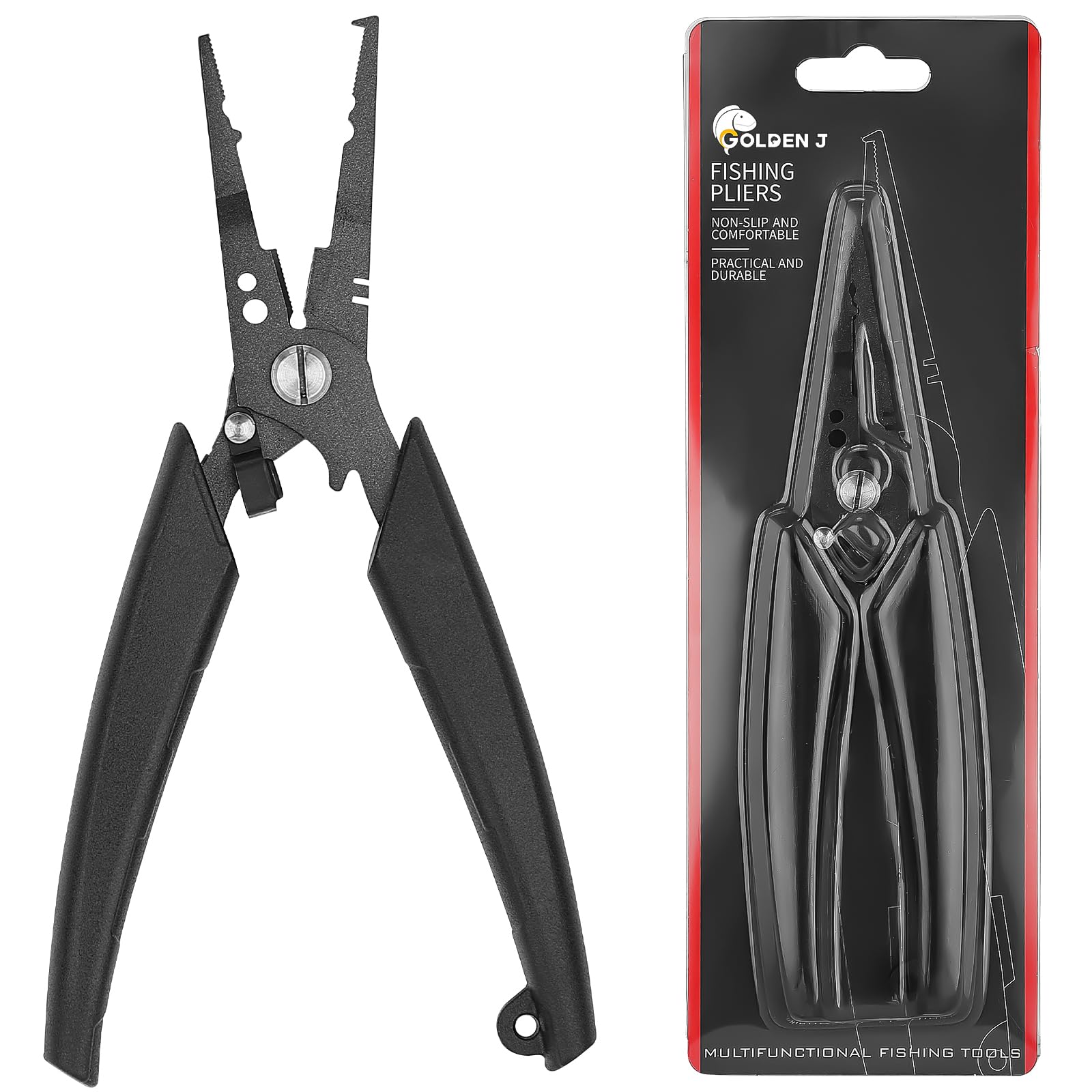 Golden J Teflon Fishing Pliers, Multi-Function Hook Remover-Split Ring Pliers, PE/Braided Line Cutter, Saltwater Resistant Fishing Gear, For Deep-Sea, Ice & Surf Fishing - Ideal for Anglers