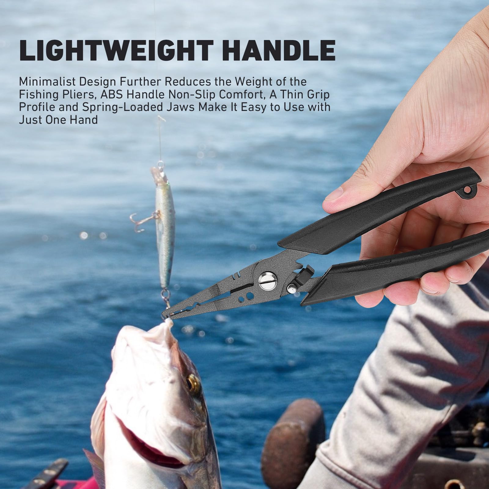 - Lightweight Handle: Minimalist Design Further Reduces the Weight of the Fishing Pliers, ABS Handle Non-Slip Comfort, A Thin Grip Profile and Spring-Loaded Jaws Make It Easy to Use with Just One Hand