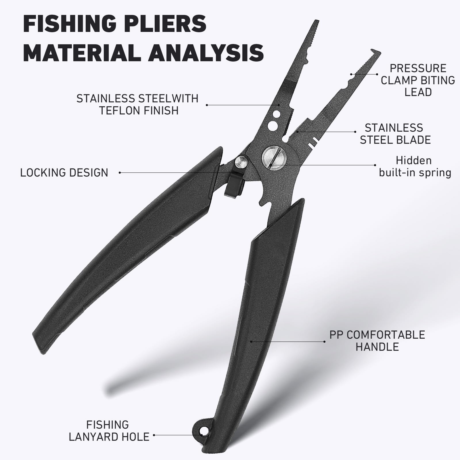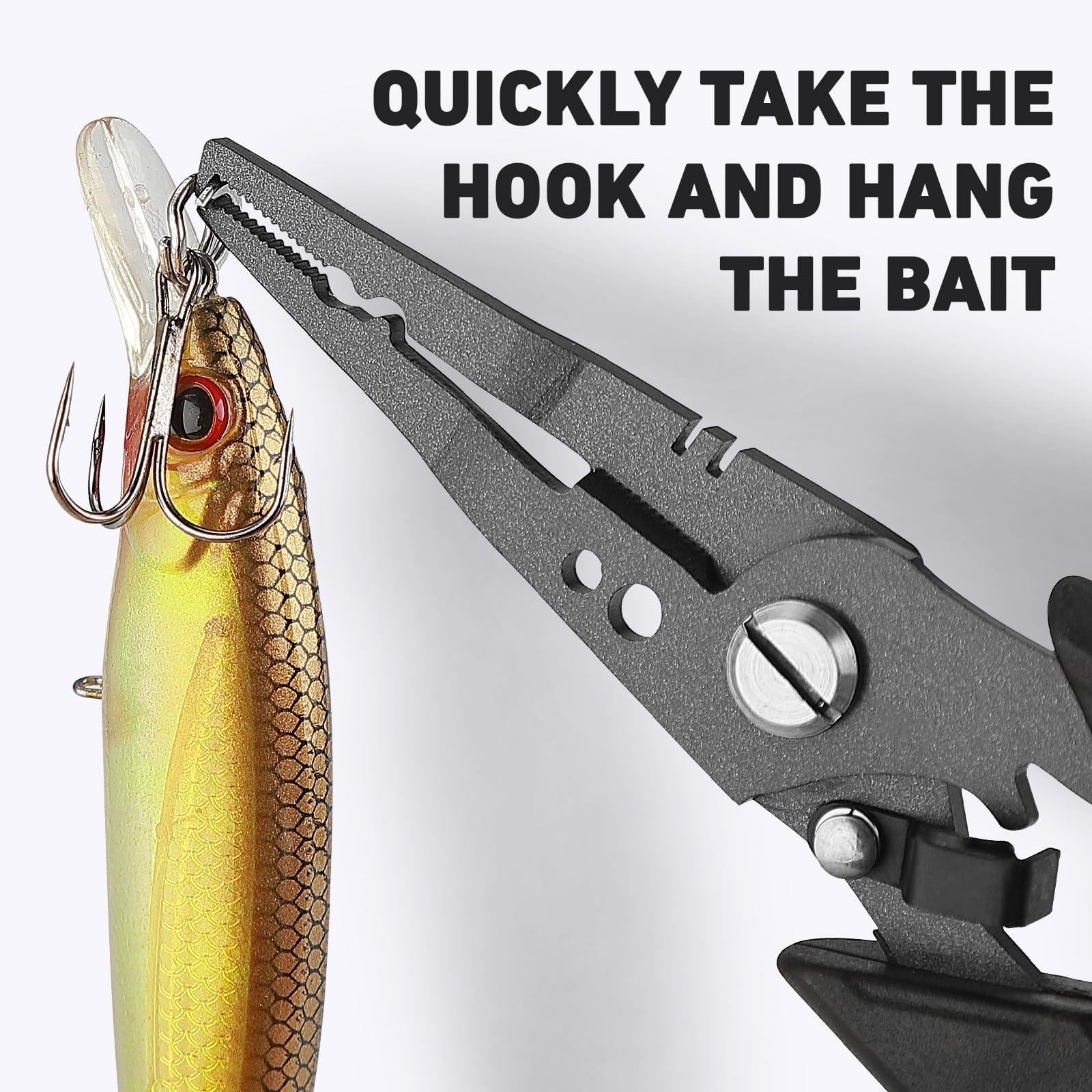 - ALL In One:The Teflon Stainless Steel Fishing Plier is Multifunctional, Splitting Rings, Removing Hooks, Cinching Knots, Tuning Your Baits, Cutting Fishing Lines, Crimping Weights, Fixed Buckle Structuer, One Tool for a Variety of Fishing Scenarios