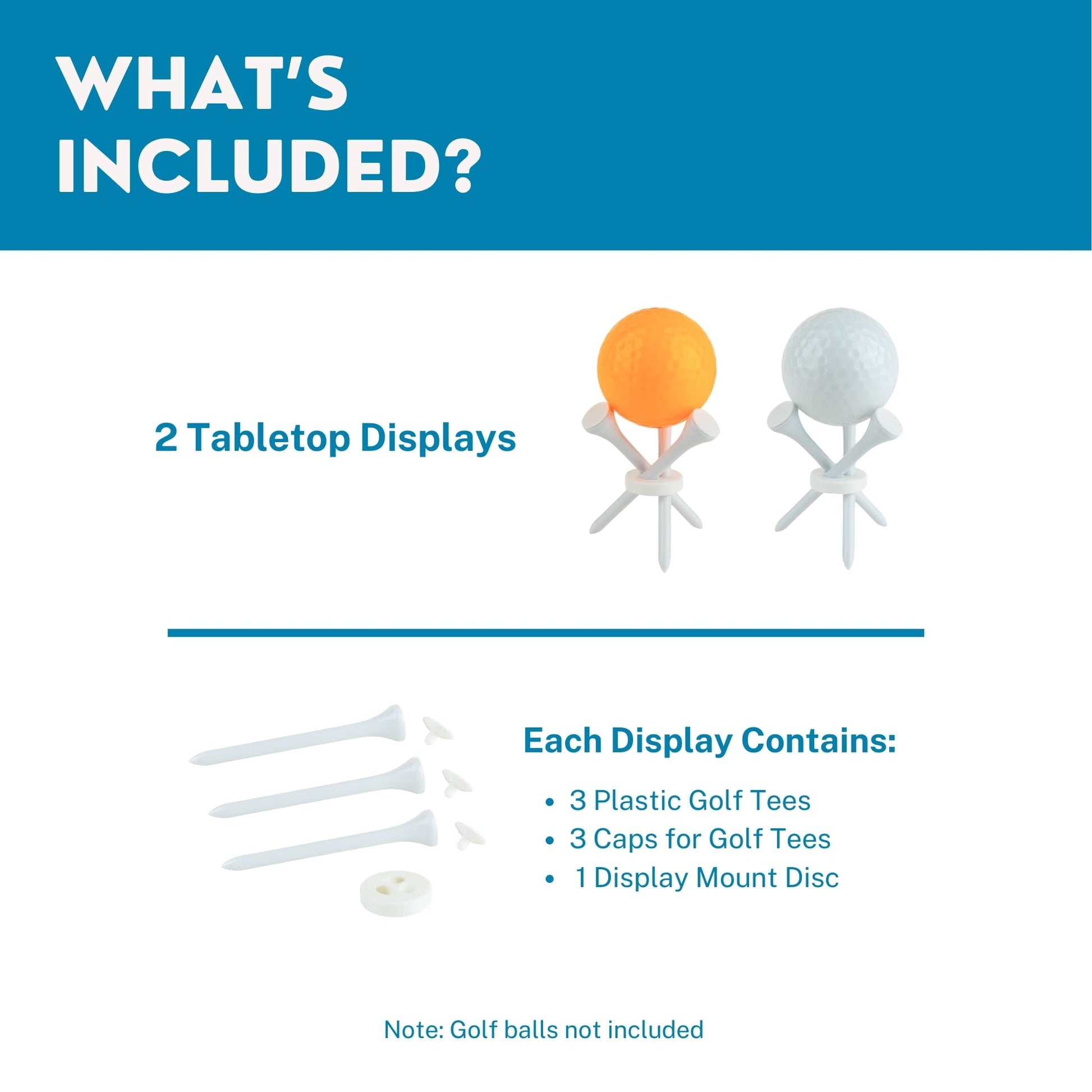 Unlike competitors, our display stand uses plastic golf tees that provide a more uniform look compared to wooden tees. In addition, our stand includes plastic caps that snap into the top of each golf tee and provide a flat, finished look to each tee.