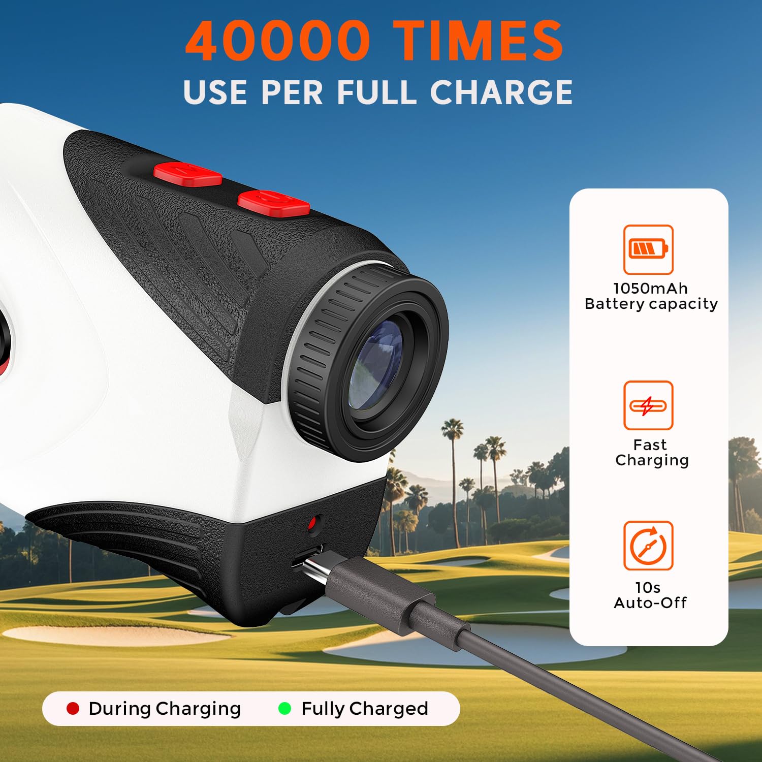 - [Rechargeable Battery & Continuous Scan Mode&Aftersales Service]Equipped with a 1050mAh battery.Powered by a USB-C rechargeable battery, 40000 times available. The continuous scan mode allows you to quickly measure multiple targets, supported by Distance Lock Technology for enhanced accuracy. Ideal for scanning golf hazards, flags, obstacles, or assessing distances in hunting scenarios.Comes with a 2-year warranty and lifetime technical support. Contact our after-sale team for any questions.