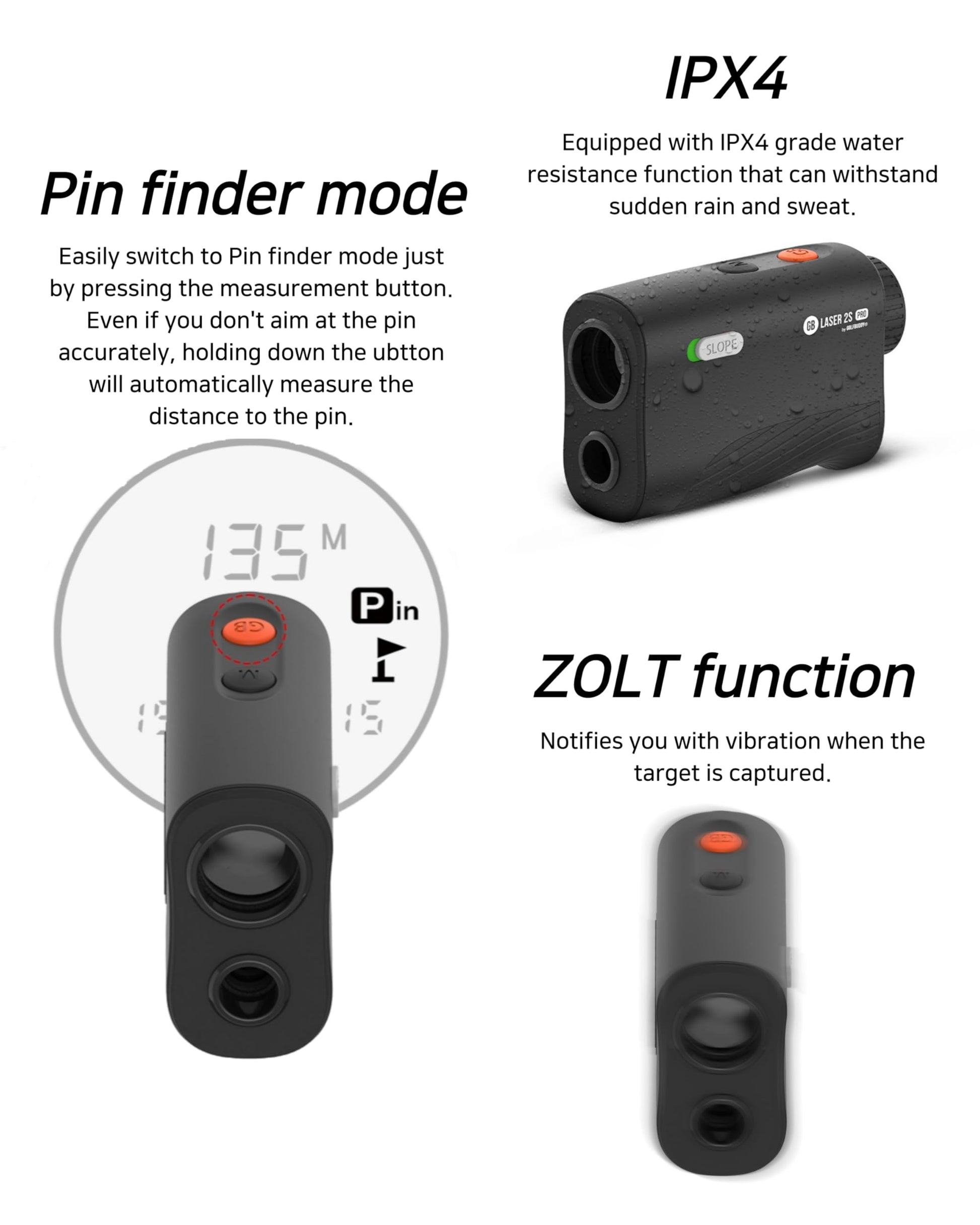 - PIN FINDER MODE WITH FLAG POLE LOCKING VIBRATION: The Pin Finder Mode simplifies the process of locating the pin. Press the measurement button, and it automatically switches to this mode, allowing you to capture the pin’s distance even if you’re not perfectly aligned. The Flag Pole Locking Vibration provides tactile feedback by vibrating when the target is locked. This feature is particularly useful in situations where visibility is limited or when you're in a hurry.