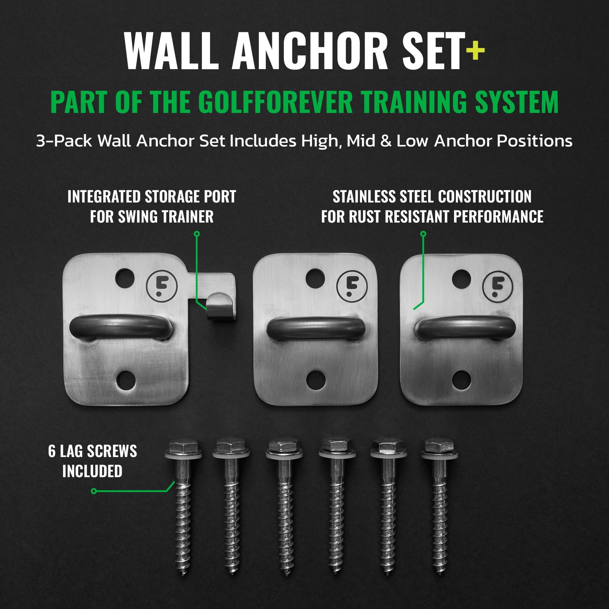 - PART OF THE GOLFFOREVER TRAINING SYSTEM: Golfforever Wall Anchor Set+ transforms your space into a golf fitness hub, enabling effective practice and training right at home. Integrated storage port for the GolfForever Swing Trainer. 3-Pack Wall Anchor Set includes High, Mid, and Low Anchor positions.