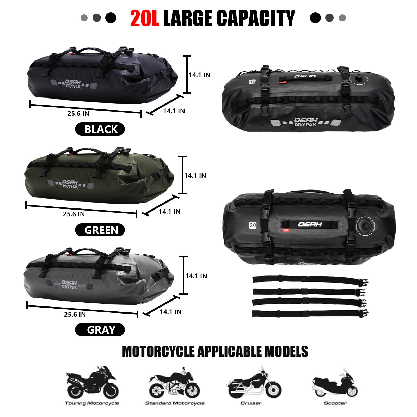 - CAPACITY MEETS DEMAND : This motorcycle tail bag has a capacity of 20 liters, providing you with spacious storage space; Equipped with MOLLE connection points for hanging keychains and water bottles, as well as stacking other bags upwards to enhance scalability; There is an air valve on the outside that maximizes capacity by releasing excess air inside the bag
