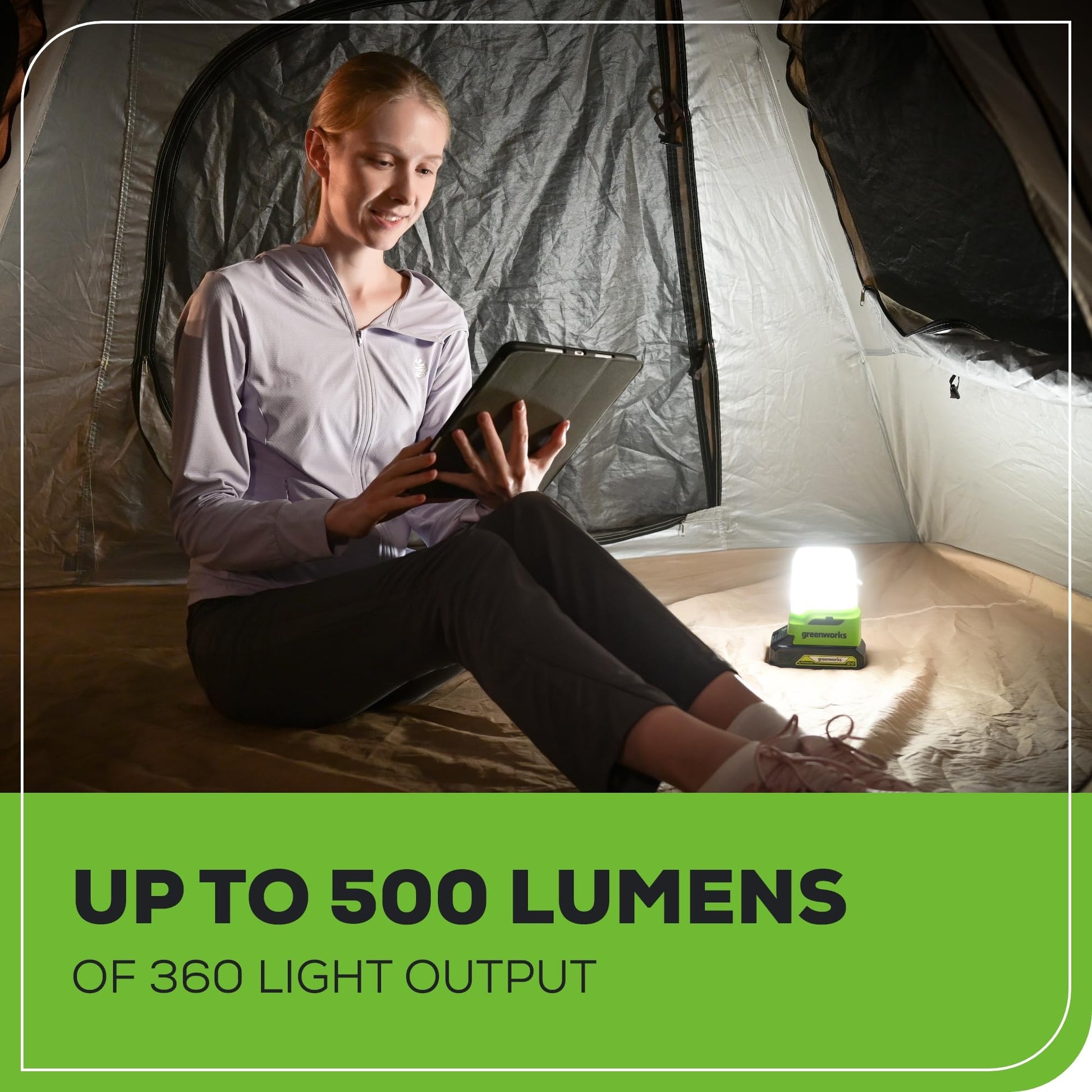 Greenworks 24V Cordless Lantern, Portable 500 Lumens Camping Light with Hook and Two USB Output Ports, 3 Modes, Mini Area Light with 2Ah Battery and Charger