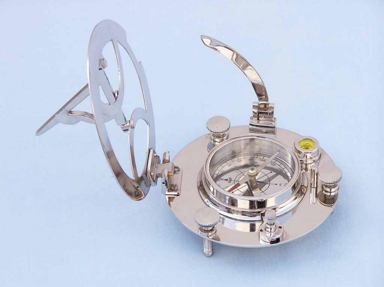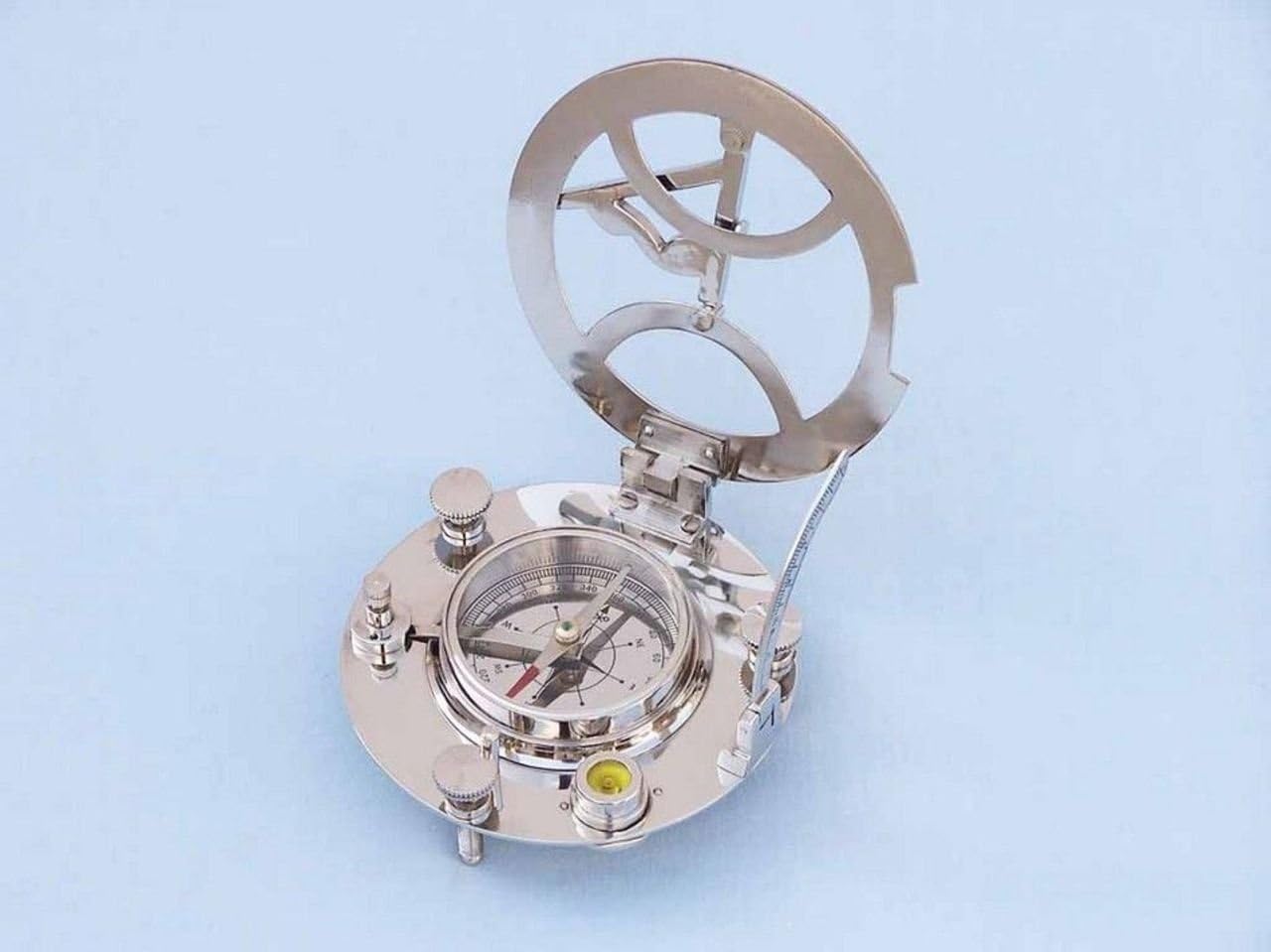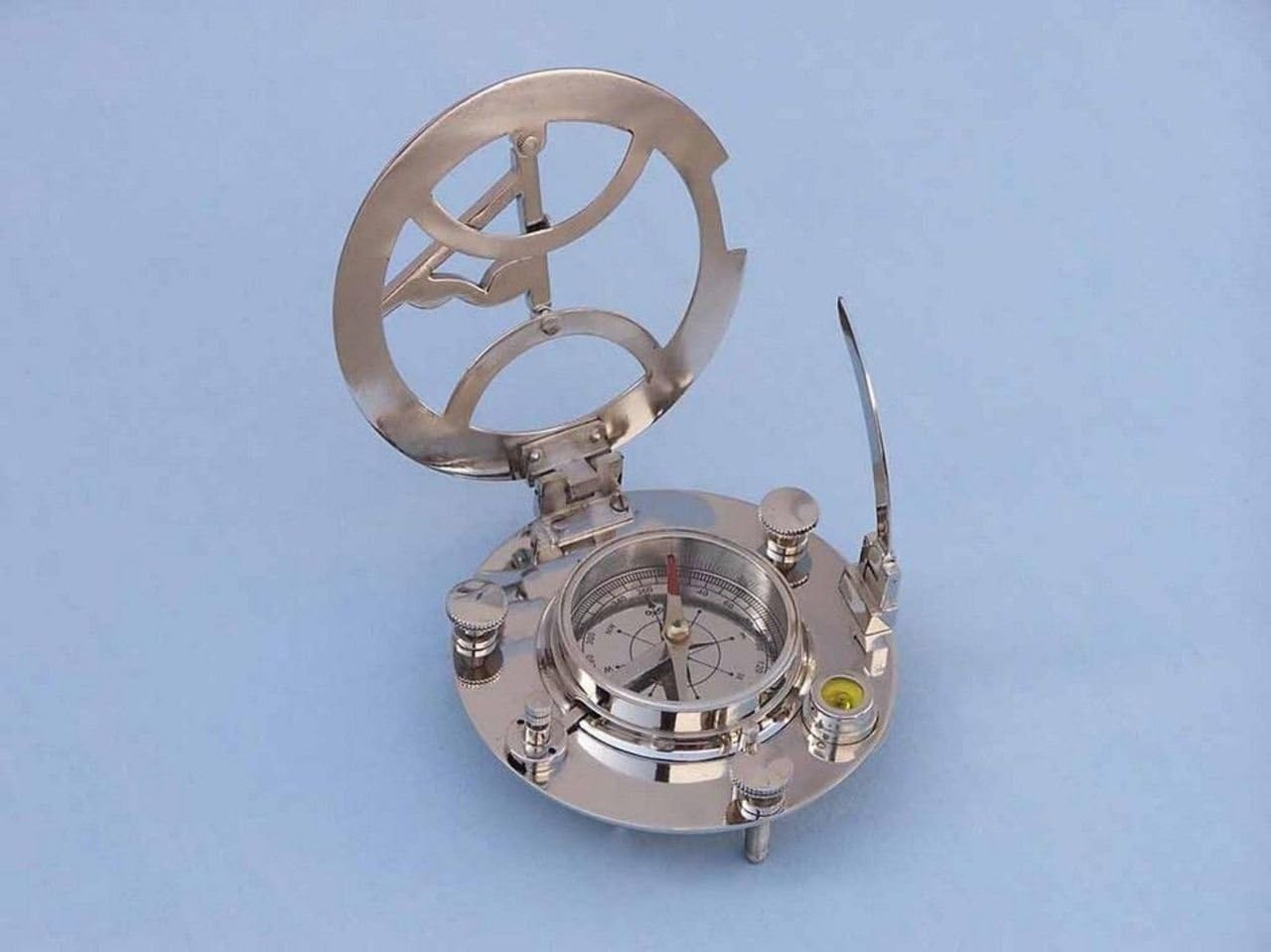 This is a beautiful Hampton Nautical 6-Inch antique brass round Sundial compass with rosewood box. The top of the Sundial is hinged and a curved scale is used to set your local latitude angle. The magnetic compass allows the Sundial to be oriented North. The compass features a needle lift mechanism to protect the compass' jeweled bearing when being transported. There are three adjustable legs that are used to precisely level the Sundial. The sun's shadow cast by the sundial's vane marks the local time.--The top of the Sundial can lay down flat, and both the latitude scale and the Sundial vane are hinged to lay flat for compact storage. A beautiful hardwood case is included for display and storage of the antique brass Sundial. The box has an anchor with rope Hampton Nautical embedded in the top of the box